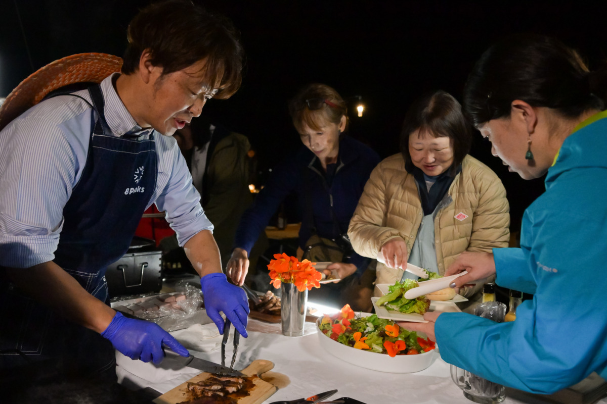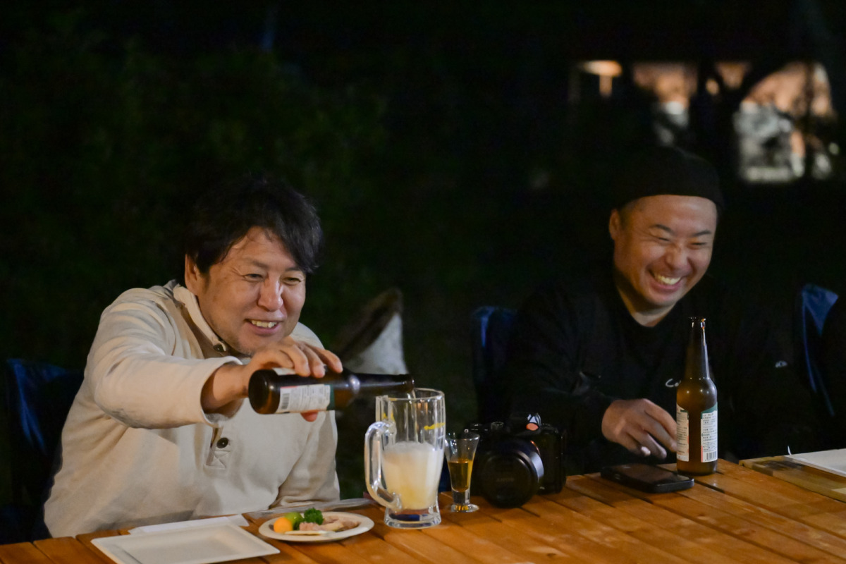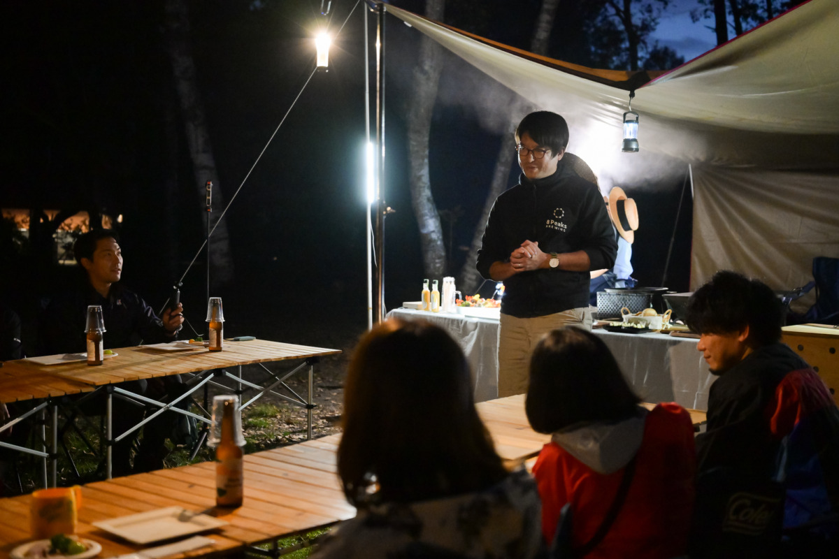 ランタンの灯りが点りはじめ、森の木々が夕闇に溶けていくころ、クラフトビール「8Peaks BREWING」を手に乾杯!