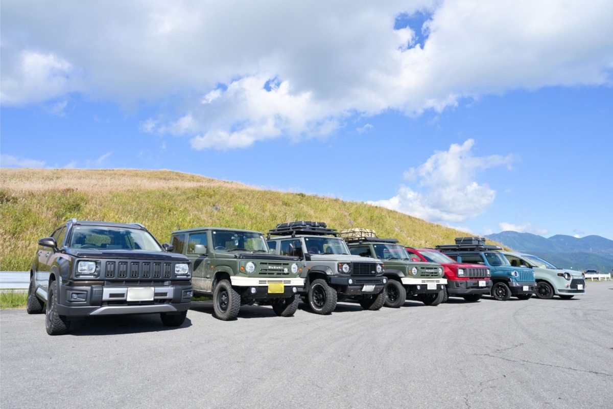 「霧ヶ峰富士見台」では、見晴らしのいい駐車場にダムドのカスタムカーをずらりと並べて記念撮影を実施。