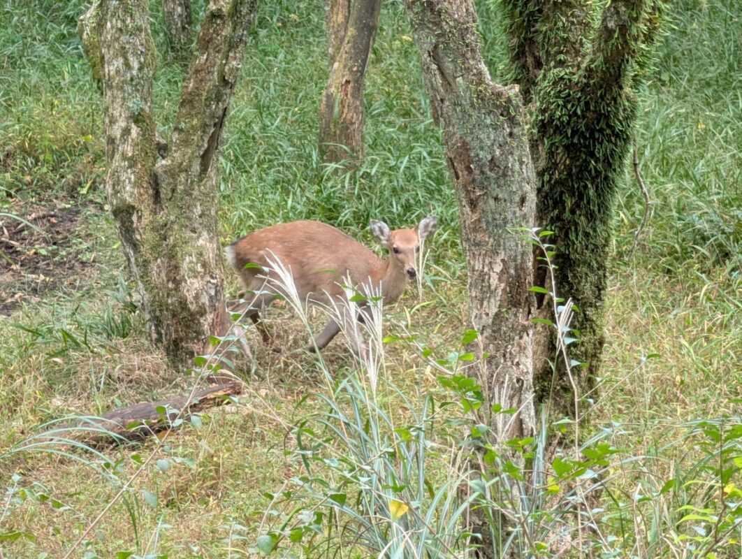 森の途中で立ち止まり、湿った土を指先でなぞりながら「ここを昨夜、シカさんが通りましたね」「これはシカさんが座っていたあとです」と。ほんの小さな足跡や折れた枝から、動物の習性や風の流れを読み取っていきます。