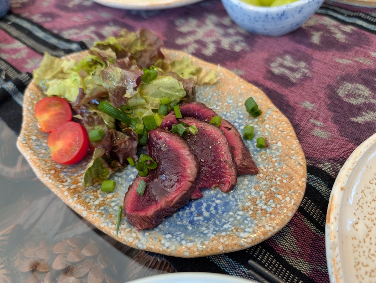 鹿肉は、驚くほどやわらかく、噛むほどに森の香りが広がります。朝採れ舞茸の天ぷら、鹿肉と猪肉の燻製も並び、まるで森のフルコース。