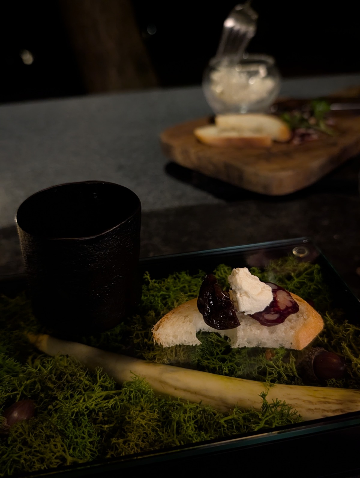 夜、星のや富士で、再びジビエ料理が登場。鹿革のカップに注がれたスープ、甲州ワインと合わせたロース肉、朴葉味噌とレバーの蒸し野菜……。