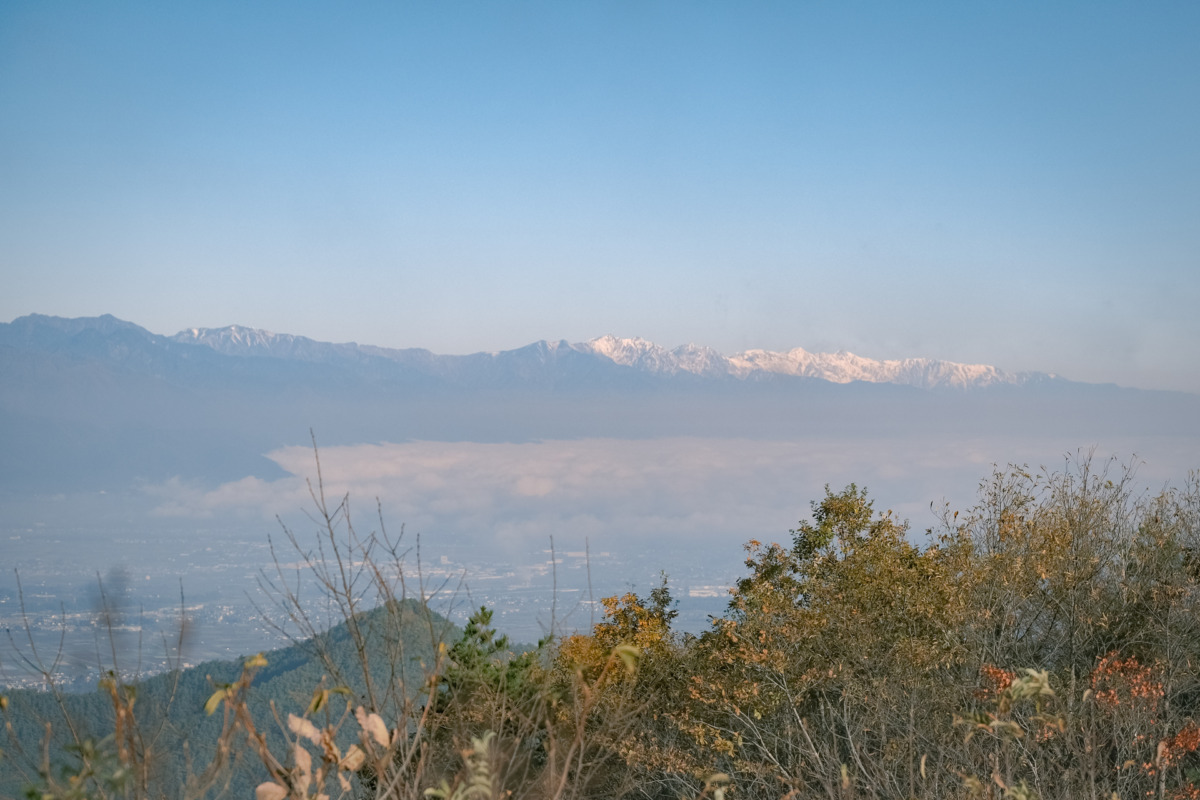 山頂に着くと遠くの霧が徐々に晴れてきて、穂高連峰に槍、遠くには白馬の山々が見えます。雲海の広がる南東方面には八ヶ岳や南アルプスと、塩尻盆地に位置するからこそのぜいたくパノラマ。