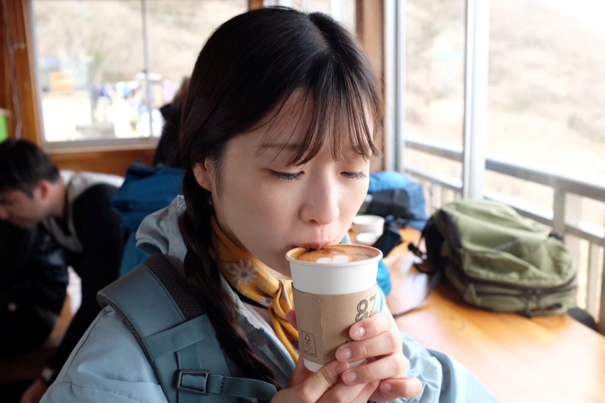 「877カフェ」でカフェラテを飲みながら、ここまで登ってきた景色を眺め、ほっとひと息。
