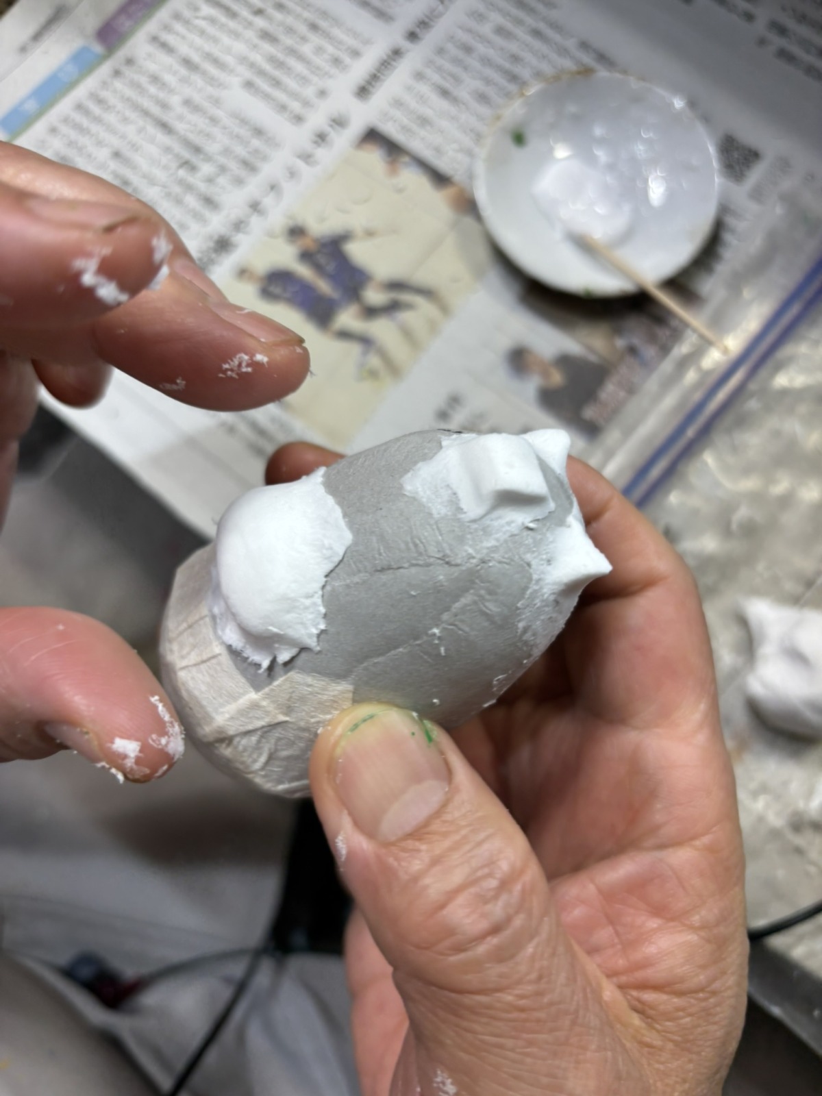 コシェルドゥのおふたりが守るのは、日本でも数少ない“内張り”の技法。石膏で作った型の内側に和紙を貼り、抜いて乾かす方法です。