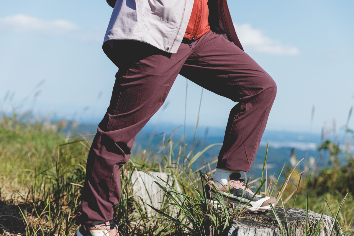 低山をつないで日帰りで歩くプチ縦走では、アップダウンがあったり、木の根や岩場を上ったりする道があることも多い。そのため、足や腕がいつでもストレスなく動かせる、ストレッチ性に優れたウエアを重ねてコーディネートするのがおすすめ。カラーは同系色でまとめてグラデーションを楽しむと、大人っぽい印象に。