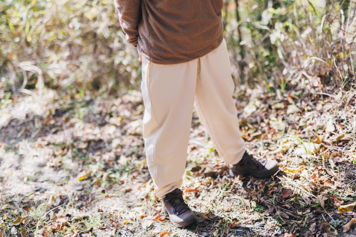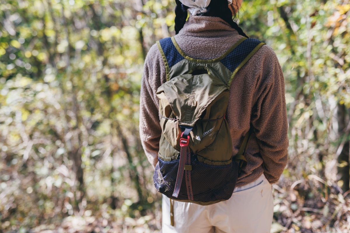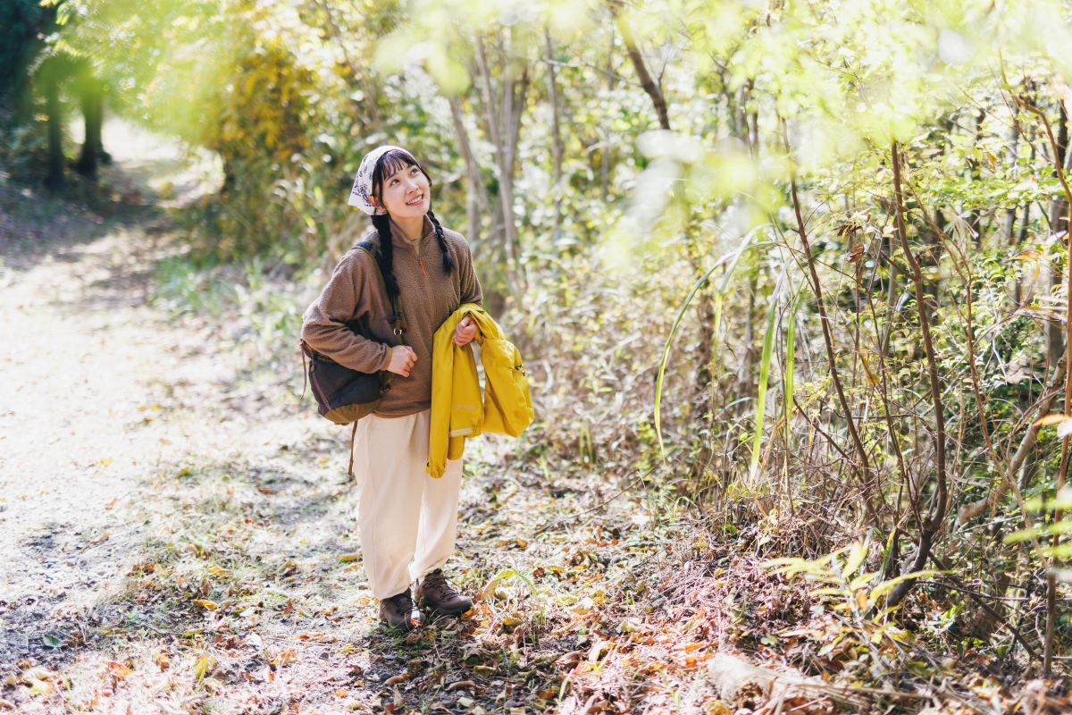天気のよい休日。お散歩気分で近所の山を午前中だけ歩くときには、ゆったりシルエットのパンツと、薄手だけど保温性に優れるフリースをさっと身につけたコーディネートで。大きすぎず軽量なバックパックには、水とおやつ、ファーストエイドなど、必要最低限の荷物を詰め込んで出発。防水透湿機能を備えるジャケットは、風よけ、雨よけのために一枚持っていきたい。