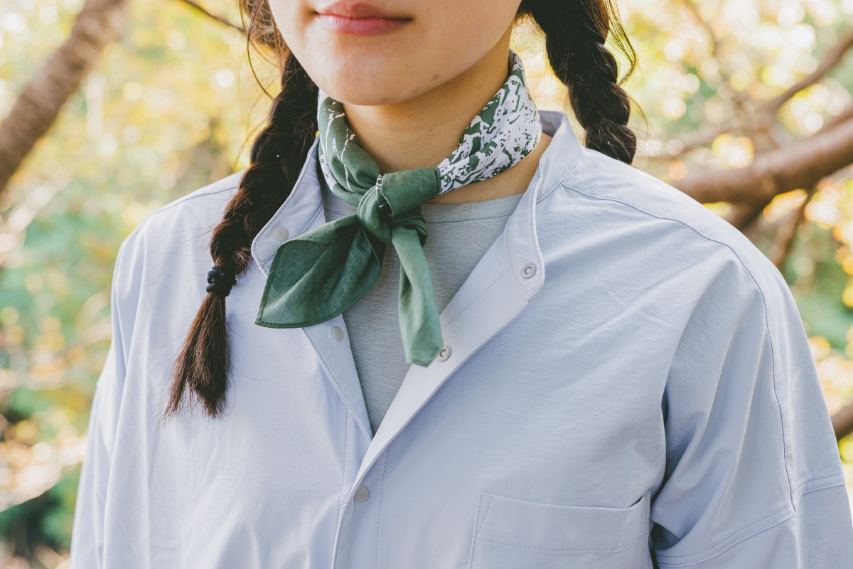 53cm正方形のバンダナは首元に巻いて、おしゃれ感と保温効果をアップ。スナップボタンを採用するシャツは、簡単にボタンの開け閉めや脱ぎ着ができて便利。ベースレイヤーには、メリノウールと再生ポリエステルを組み合わせた調温、吸湿、防臭効果に優れた一枚を。