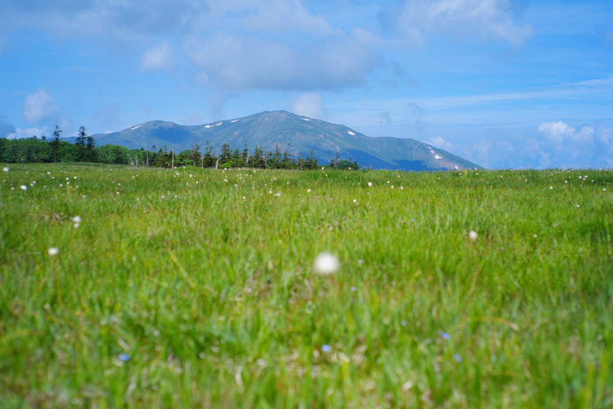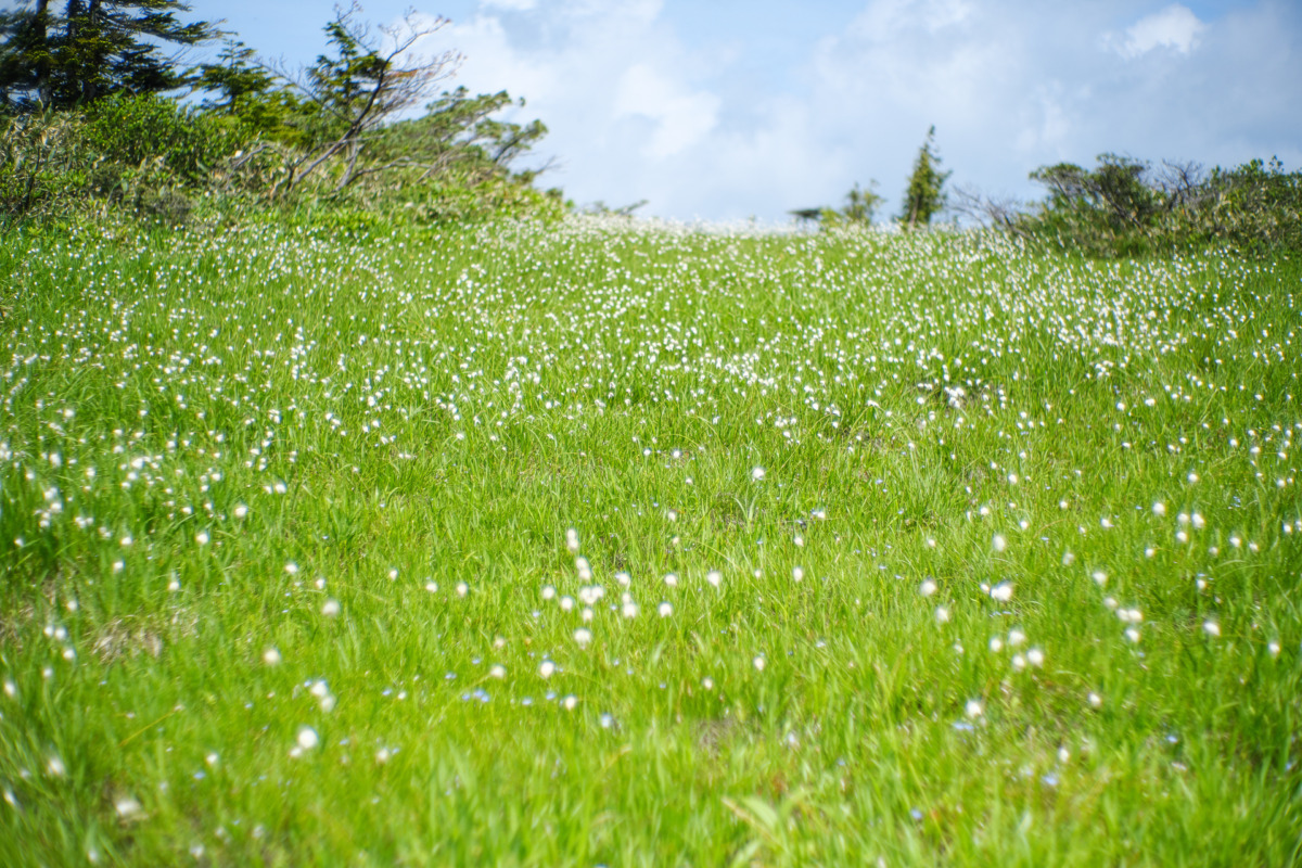 中原山を越え、横田代から1時間ほど歩いてアヤメ平に到着。ワタスゲの白い果穂がふわふわと揺れています。だれもいないのを良いことに、木道に寝転び空を仰ぐ。頬の横には白いワタスゲ。見たかった景色、会いたかった花。