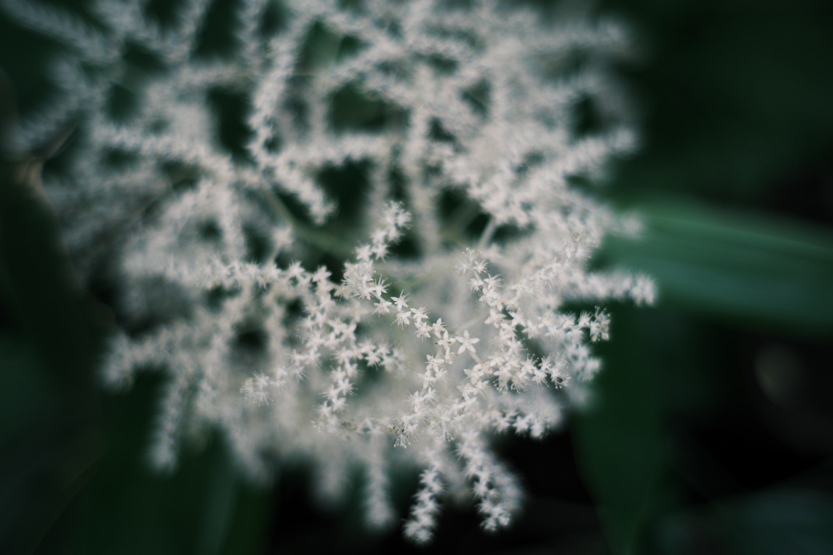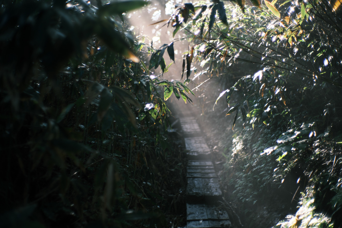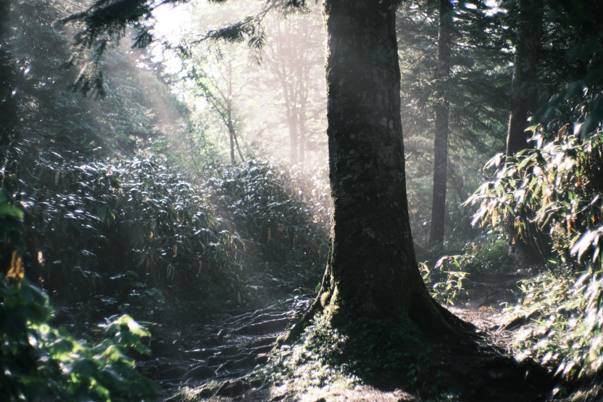 森の木々に朝の光が差し込んでいます。昨夜は雨が降ったのか、あたりは露でしっとり。きらきら光る木の葉や雫に心惹かれ、しばし足を止めてシャッターを切りました。