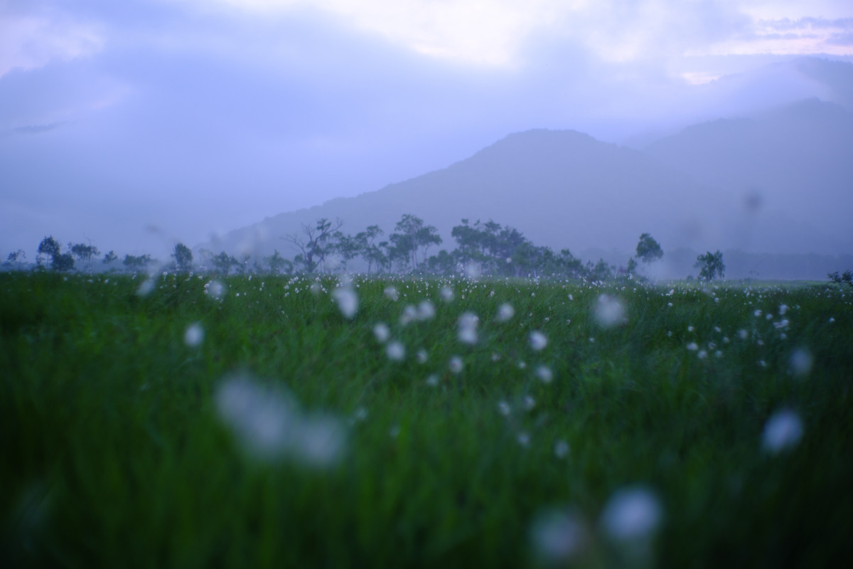 山小屋に着いて荷物を下ろしたら、夕暮れの尾瀬ヶ原を散策しましょう。至仏山の向こうに沈む夕日。そよ吹く風。ワタスゲに当たる光も最後のきらめきを見せると、優しい光に変わっていきます。