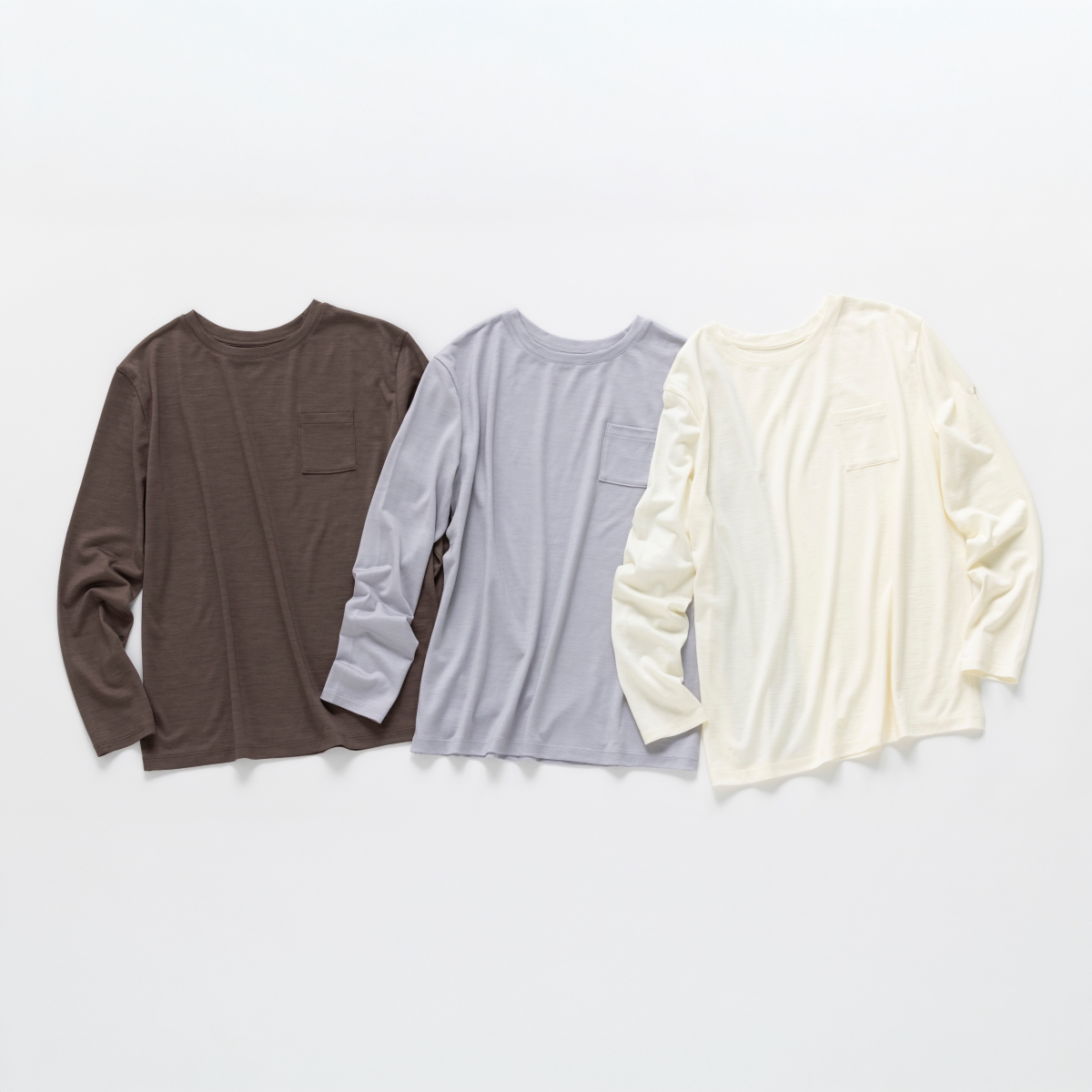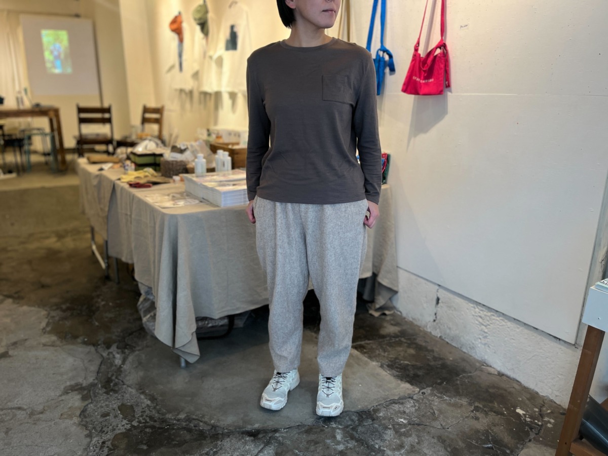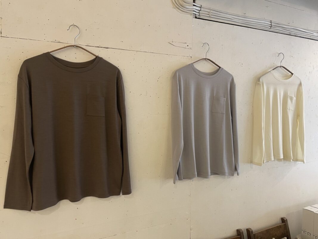 今回、かわり芽から発売された「胸にポケット 長袖ウールTシャツ」は、細番手のウール糸を使用しているため、さらさらとした肌触り。とても着心地がいい。ほどよくストレッチも効いています。身幅にゆとりがあるため体のラインを拾いにくく、ポケットが付いていることから一枚で着ていても肌着感はなし。いまの季節は、ベストを重ねたり、セーターを重ねたり。着回し力はバツグンです。