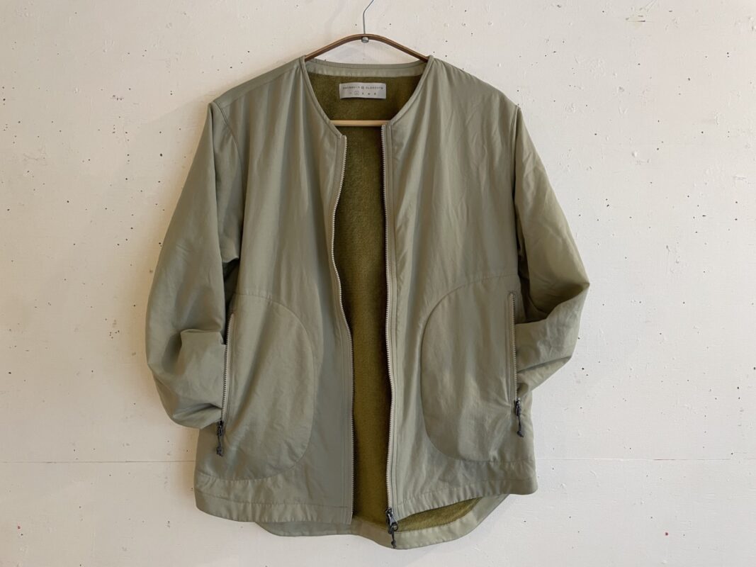 裏地に配されているポリエステル素材・オクタは、軽量かつ、吸湿速乾性、通気性、保温性に優れる。ハイイロとグリーンの配色、ラウンドネックも好み。ダブルジップ仕様で、裾からさっと開けられるのもうれしいポイント。