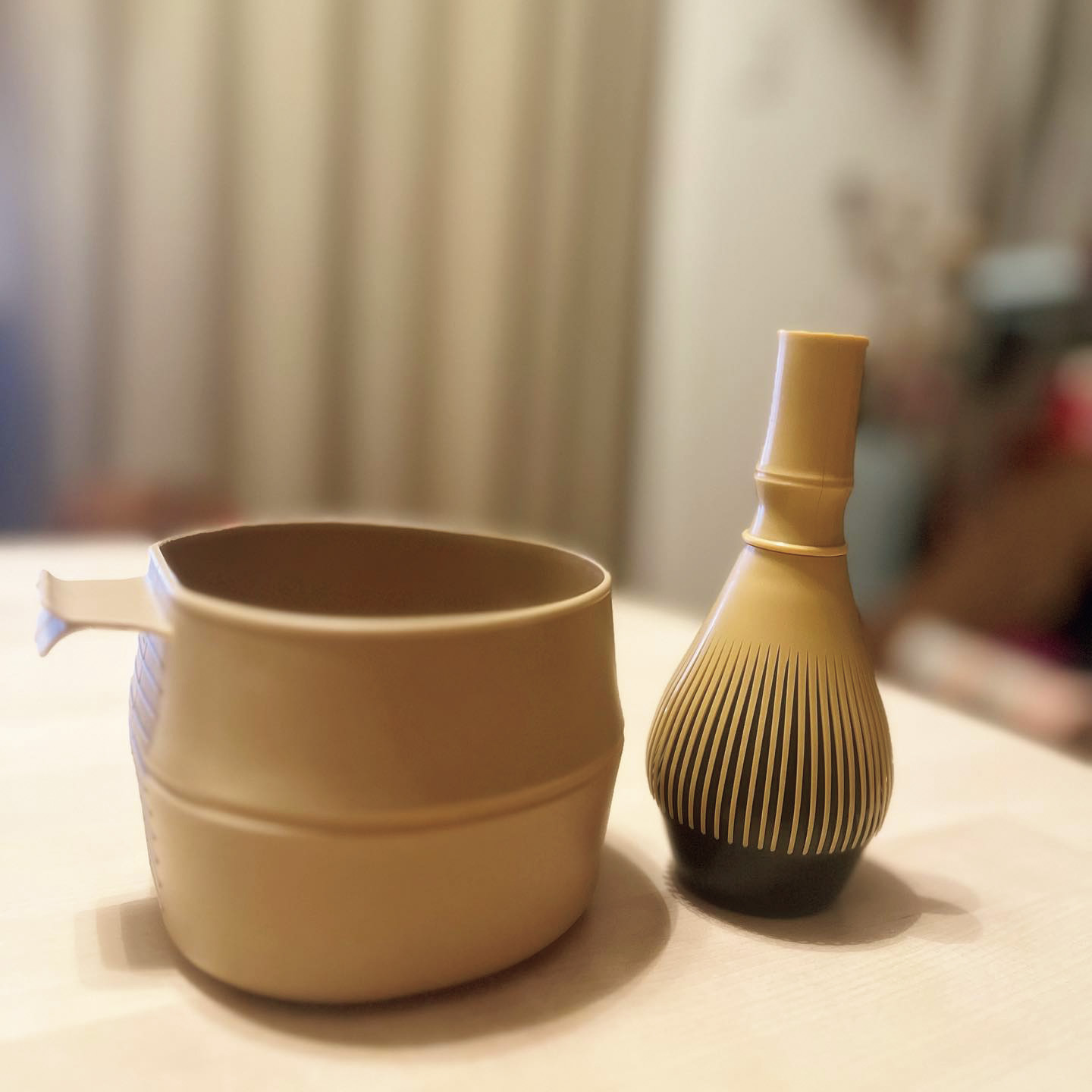 抹茶と器、茶筅、お湯があればOK。器はシェラカップや折りたたみカップ、使い捨てボウルで十分。茶筅は軽いプラスチック製も便利。お湯はガスで沸かしたり、山専用保温ボトルなら適温で手軽に。