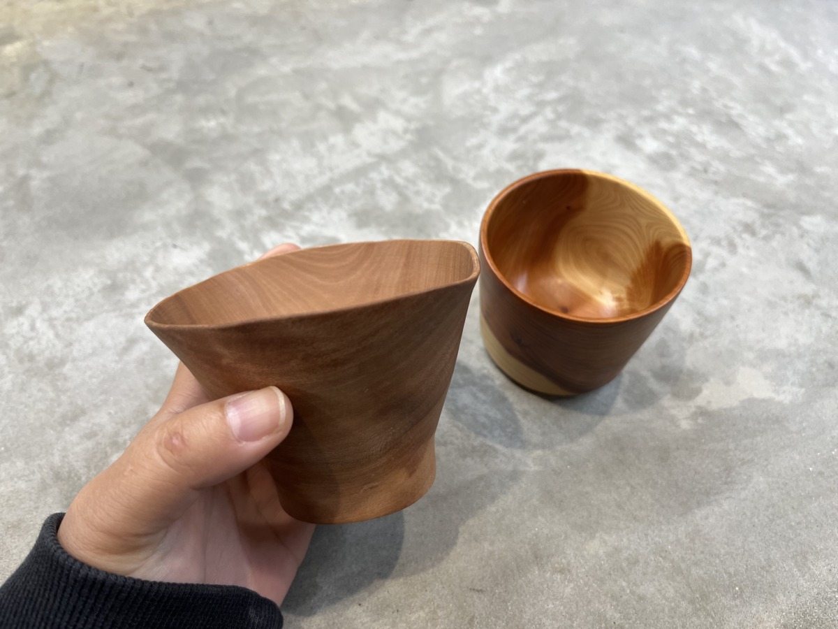 地元産の木材を使用した、一点もののぐい呑み。軽くて口当たりが優しく、木のぬくもりが手にしっくりとなじむ。「自然のなかで特別な時間を楽しむのにぴったりです。お気に入りのひとつを見つけて、ぜひ山へ連れて行ってください!」と積田さん。最近のブームは、山頂でぐい呑みを使って飲む梅昆布茶だそう。