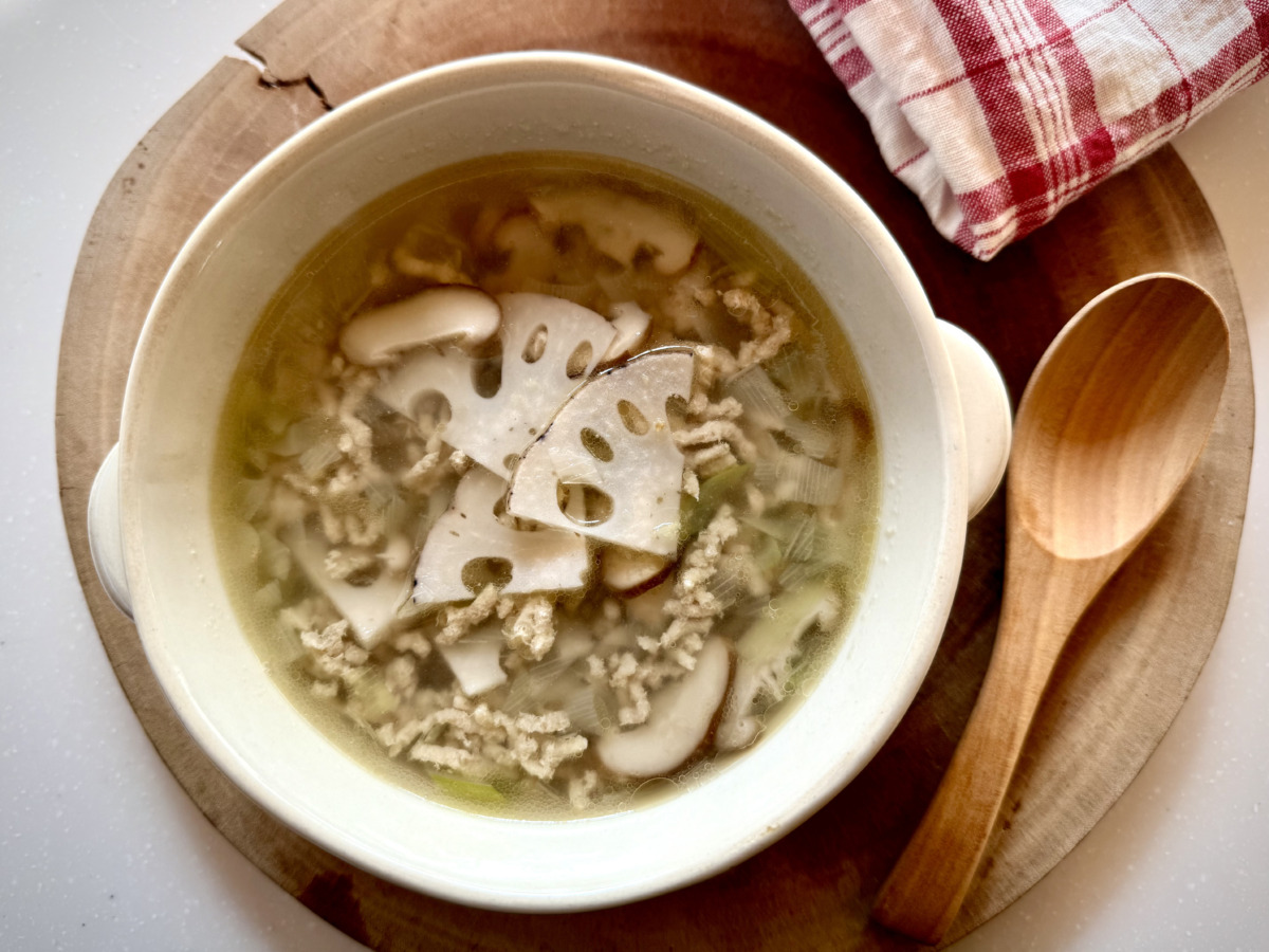 このスープは、風邪をひきにくい体づくりを目的とした薬膳スープです。鶏もも肉は体力や免疫の土台となる「気」を補い、生姜と白ネギは体を温め、喉や鼻など風邪の入り口を守ります。レンコンは肺を潤して粘膜を強くし、乾燥や咳の予防に。シイタケは抵抗力を支え、体調を崩しにくい状態へ導きます。体調を整え、免疫を落とさないことは、非常時にも自分や家族を守る備えとなり、防災につながります!