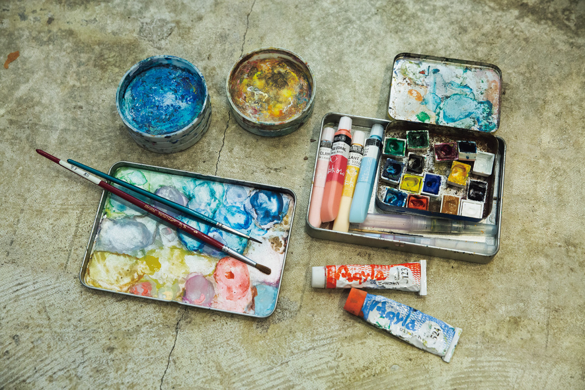 佳美さんは固形水彩絵具を愛用。コンパクトで、少し時間が空いても水を含ませればすぐ復活するのが便利。「色鉛筆やボールペン、鉛筆でも十分。偶然居合わせた人に借りたペンで描くのも思い出になります」(佳美さん)