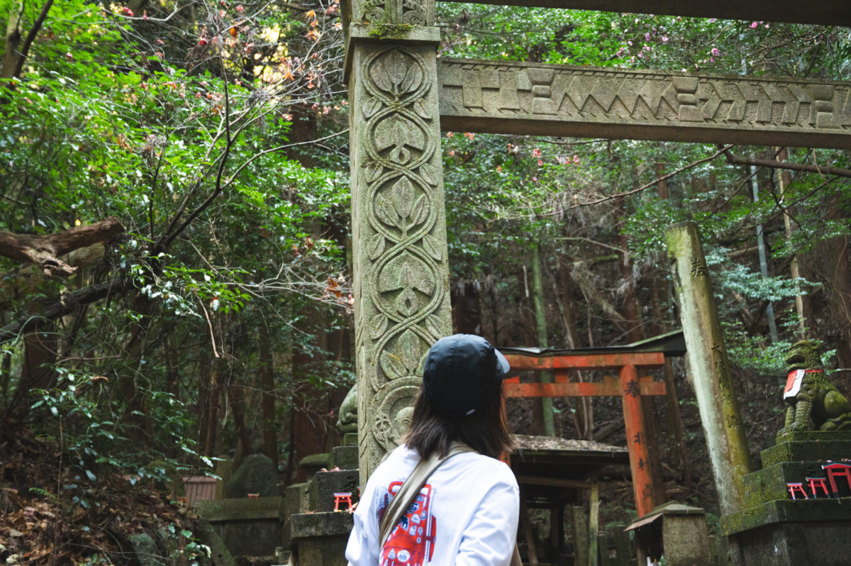 大岩神社を通るルートで、細かい彫刻が美しい鳥居を発見。これは日本画家・堂本印象とその母が、病気から野回復への感謝を込めて奉納したものだそう。