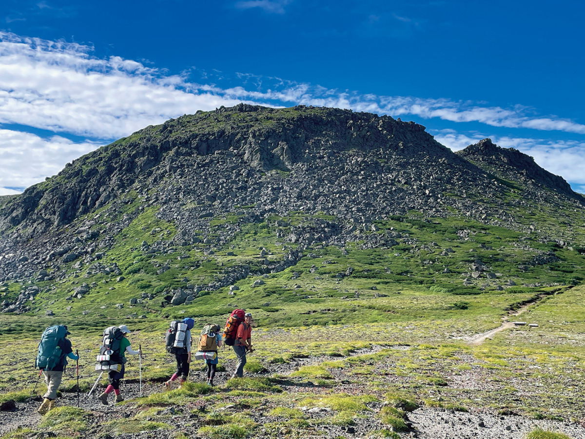 ▲夏の大雪山系の縦走をガイドする。写真は白雲岳。山のなかですごす時間が長いほど、魅力があると思っている。参加者のバックパックも大きいが、野村さんのバックパックはいっそう大きい