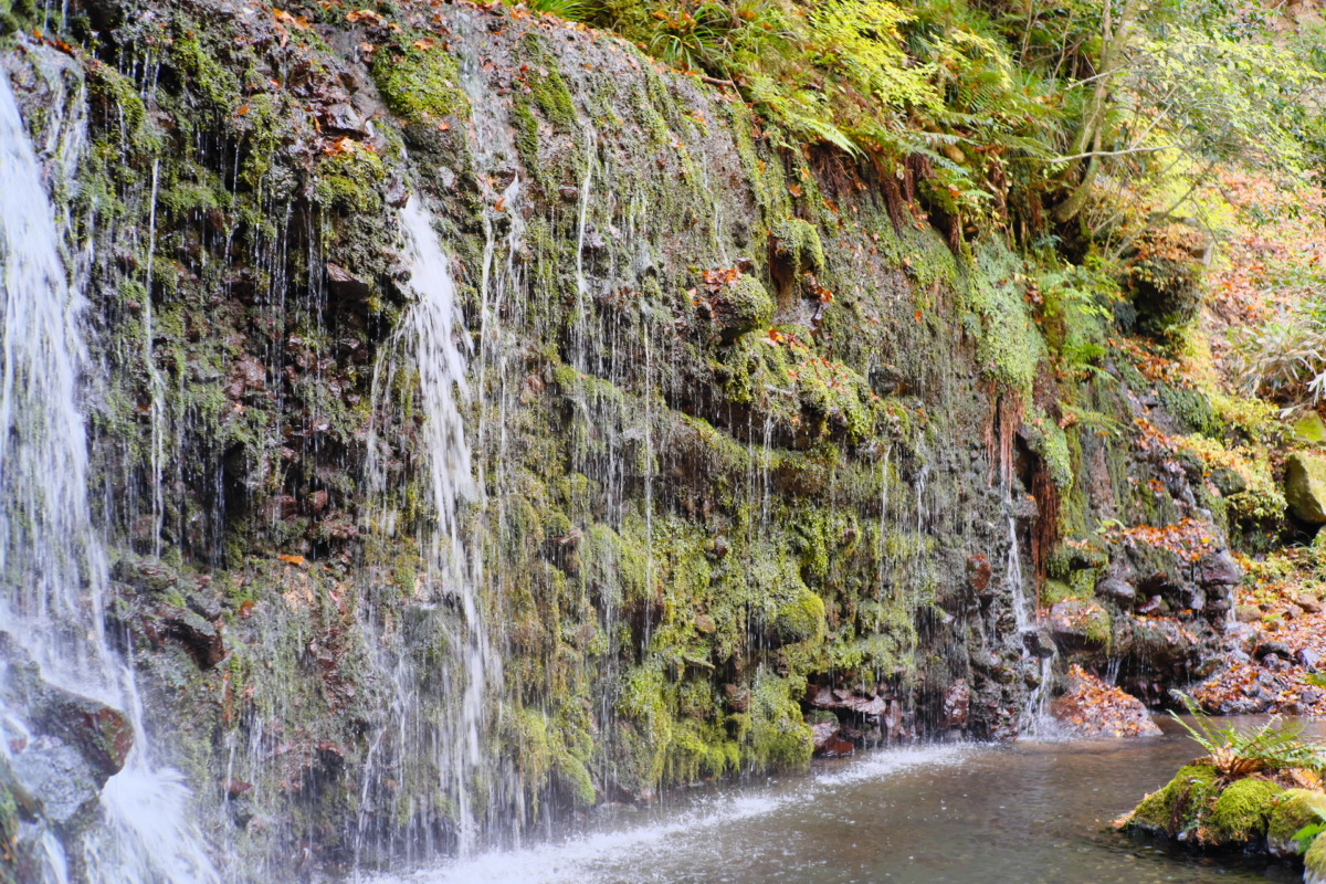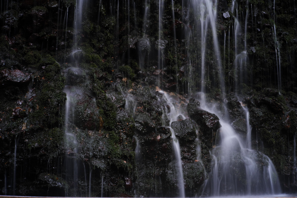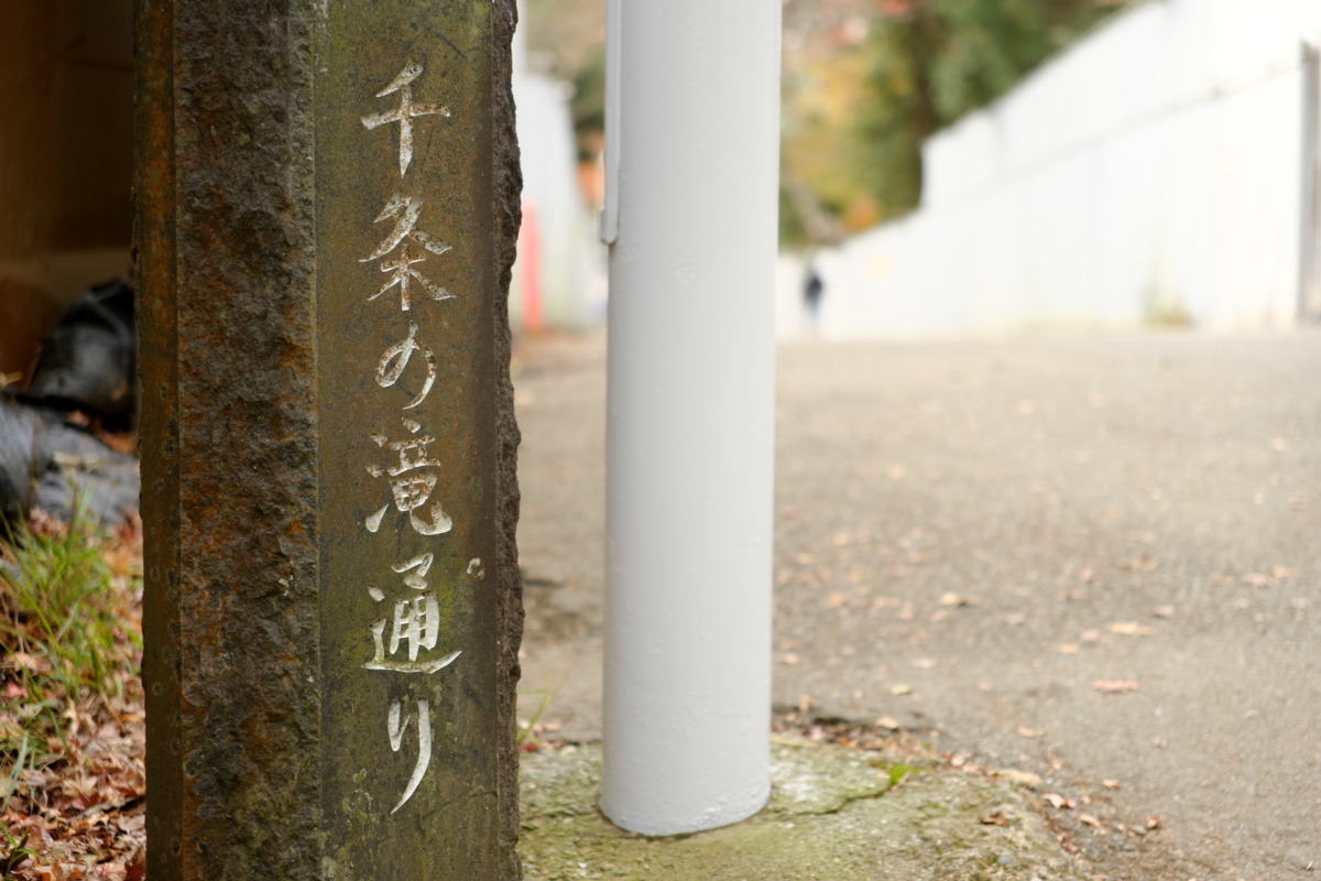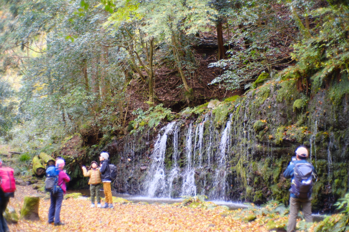駅から徒歩25分ほどで千条の滝に到着。この滝、落差は数メートルと低いものの、横幅が広く、幾筋もの流れがしぶきを上げて流れ落ちています。水辺の癒される空間。同行の仲間がしばし滝撮影に熱中していました。
