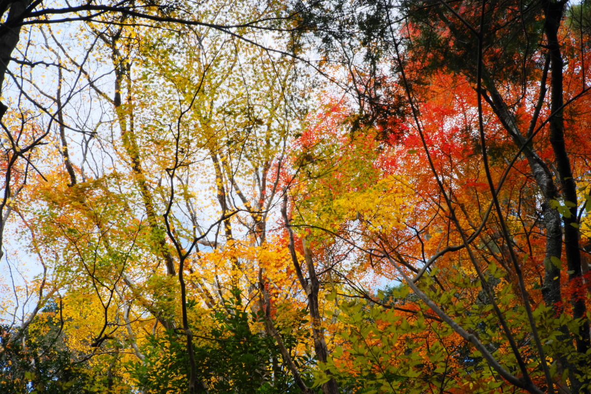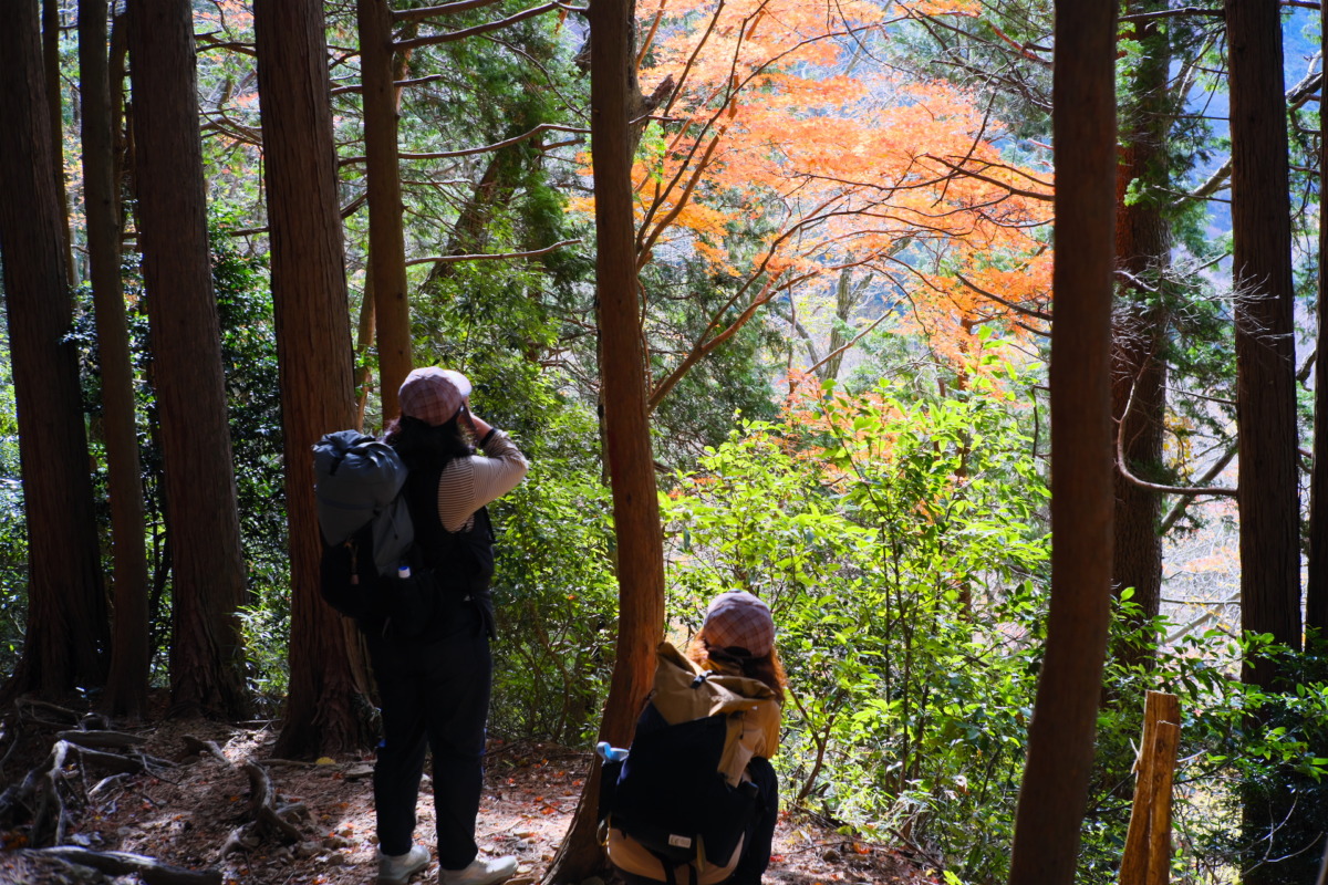 さあ、橋を渡って登山道に入りましょう。樹林帯を縫うように登山道が続いています。浅間山まで40分ほどの登り。紅葉の季節は、頭上にも谷間にも赤や黄色の木々が見えて、飽きることがありません。