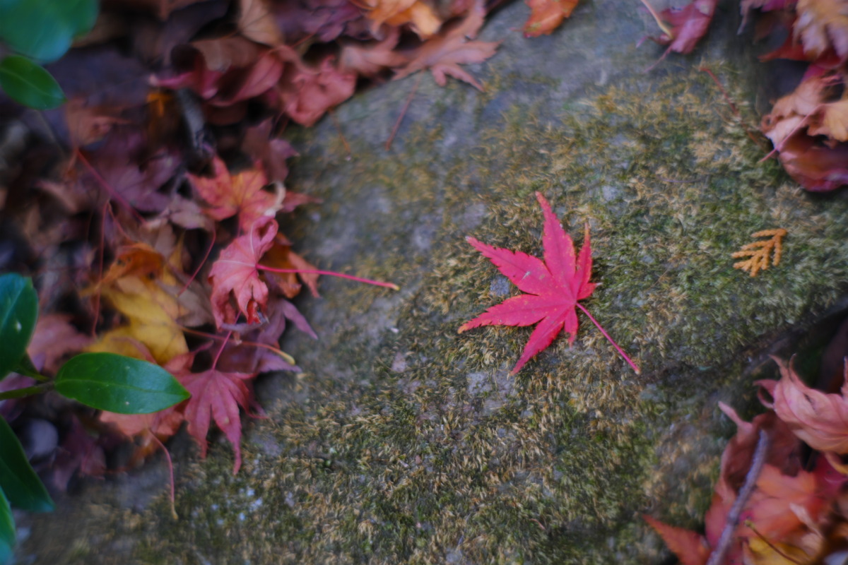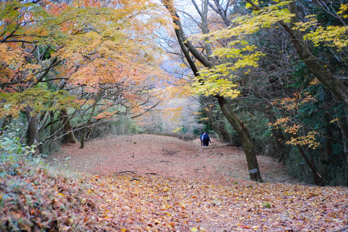 頭上には赤いモミジ。足下には散り敷いたモミジの葉。湯坂路のおすすめシーズンは、何といっても紅葉の時期。11月中旬から下旬にかけて見頃です。