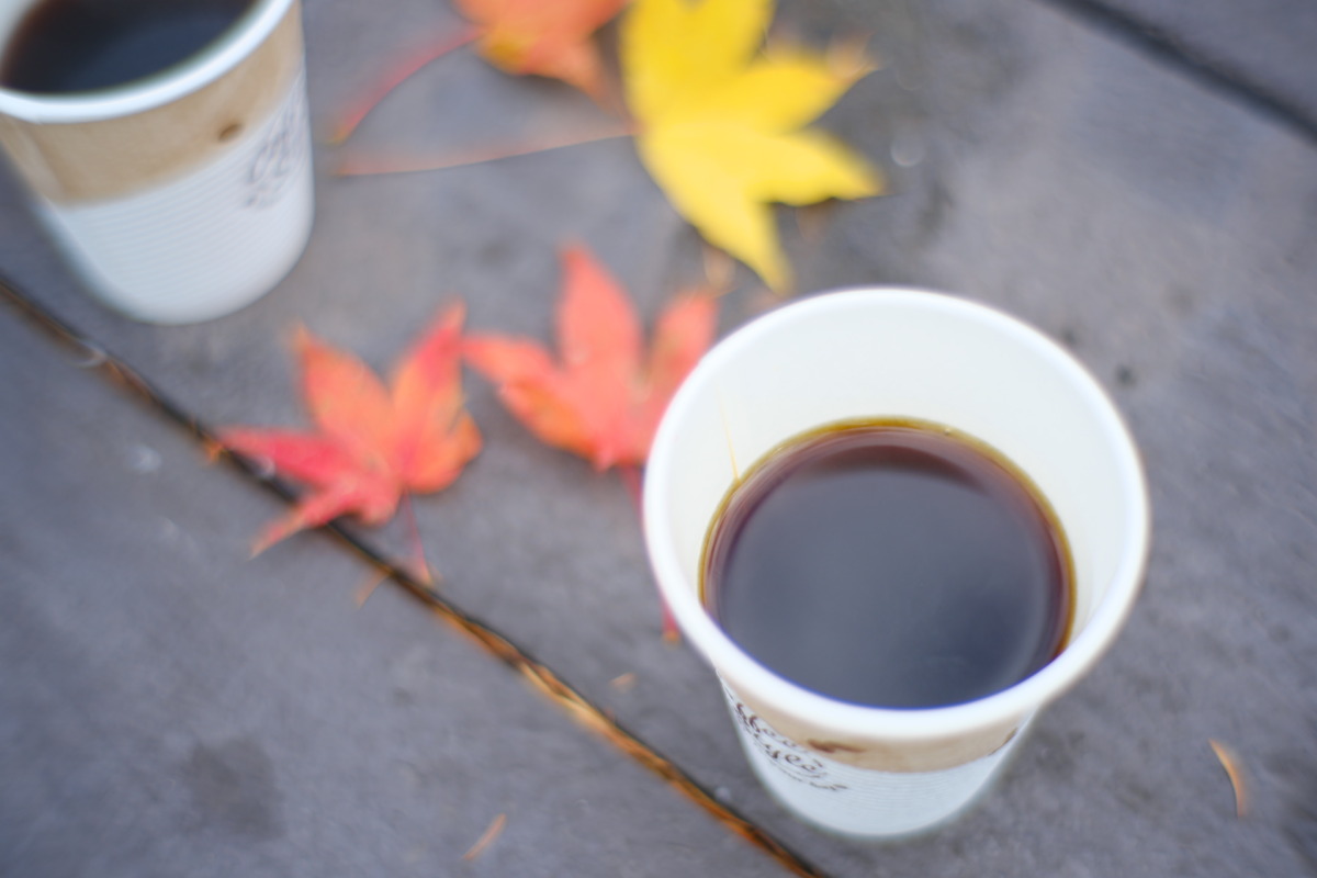浅間山(せんげんやま)の山頂は、広々とした尾根の上にあります。芝生の上で休んでもよし、テーブルとベンチを利用してもよし。少し寒かったので、コーヒーを淹れて温まりました。仲間との登山談義に花が咲きます。
