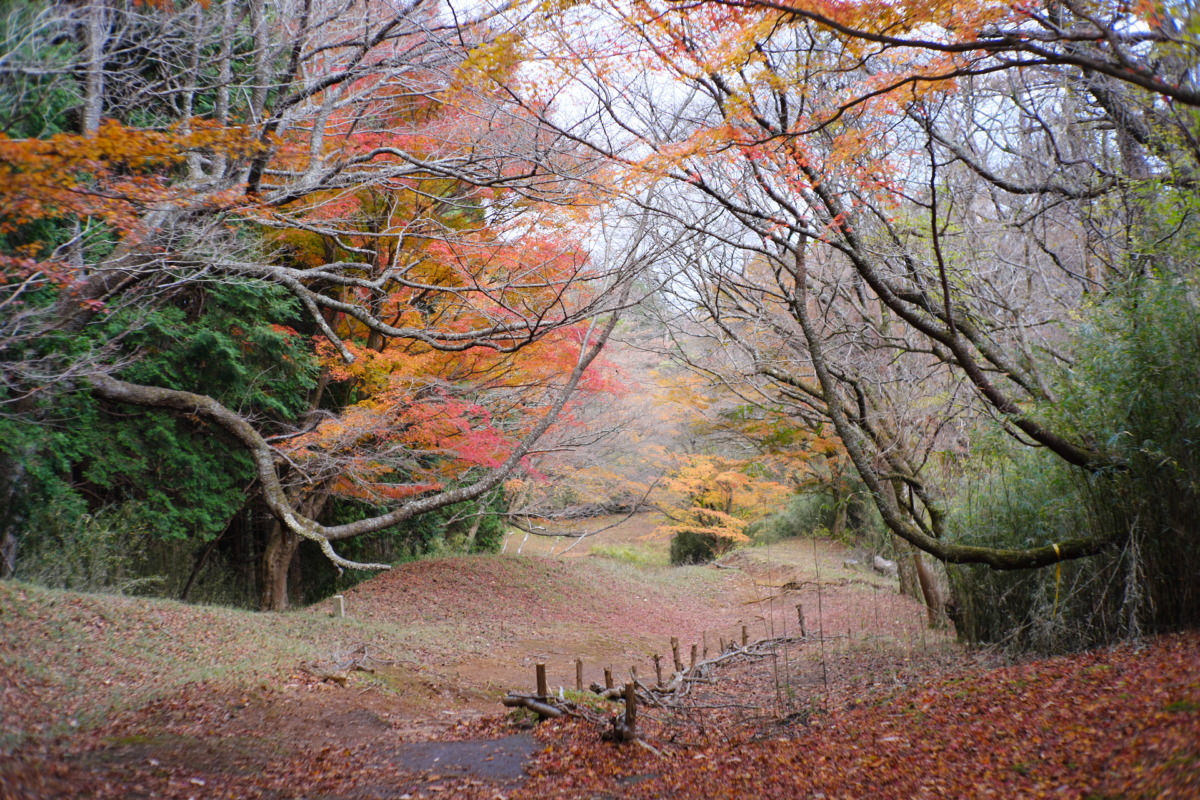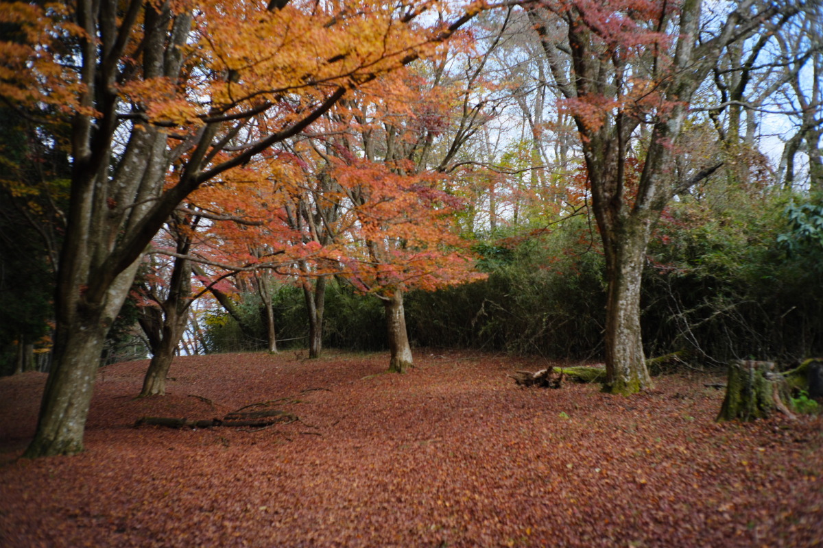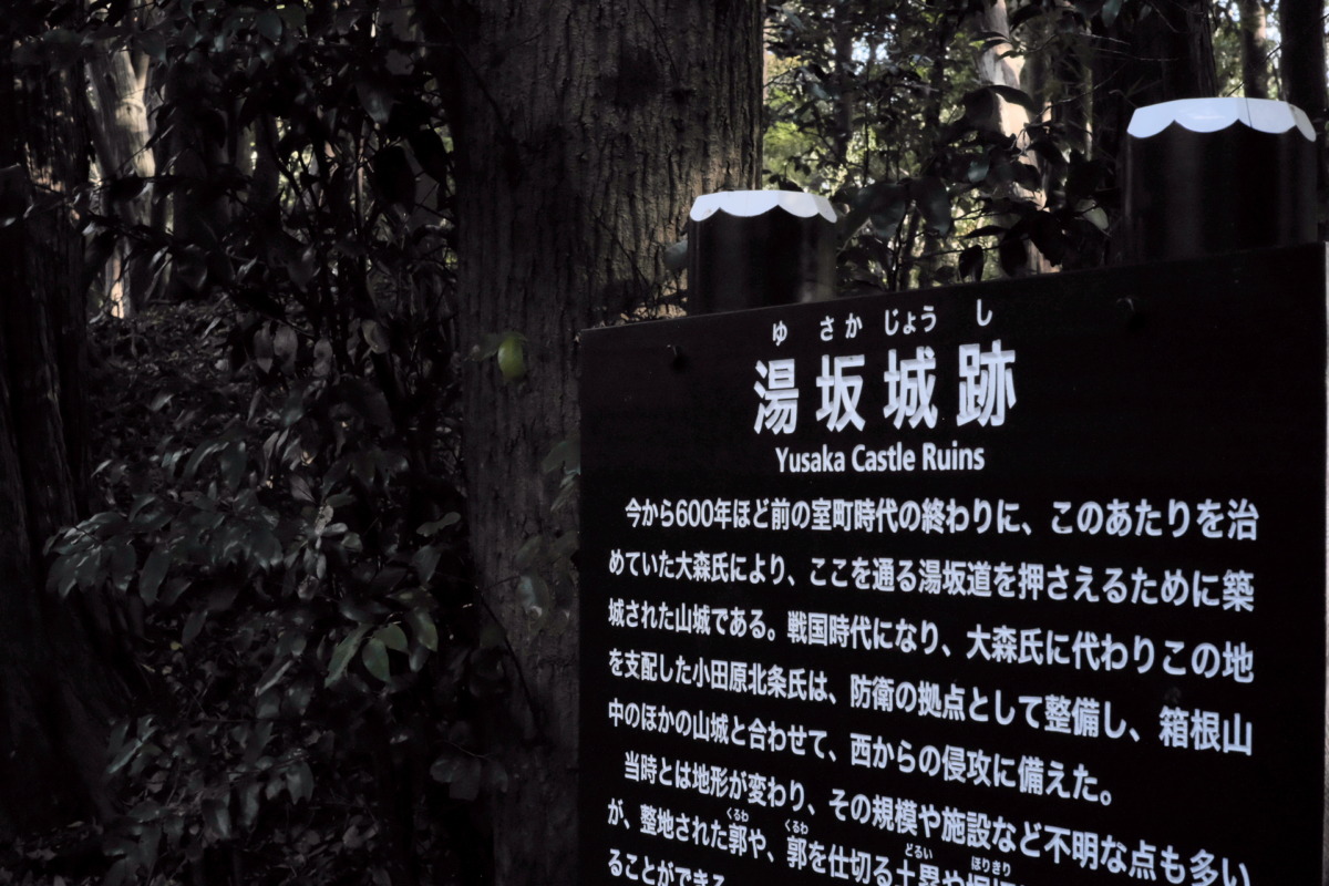 やがて、登山道は深い森に入ります。やや急な木の根道を下り、さらに進んで行くと湯坂城址に出ます。土塁の跡がかすかに残るこの山城は、室町時代の終わりにこの辺りを治めていた大森氏によって築城されたものだそうです。