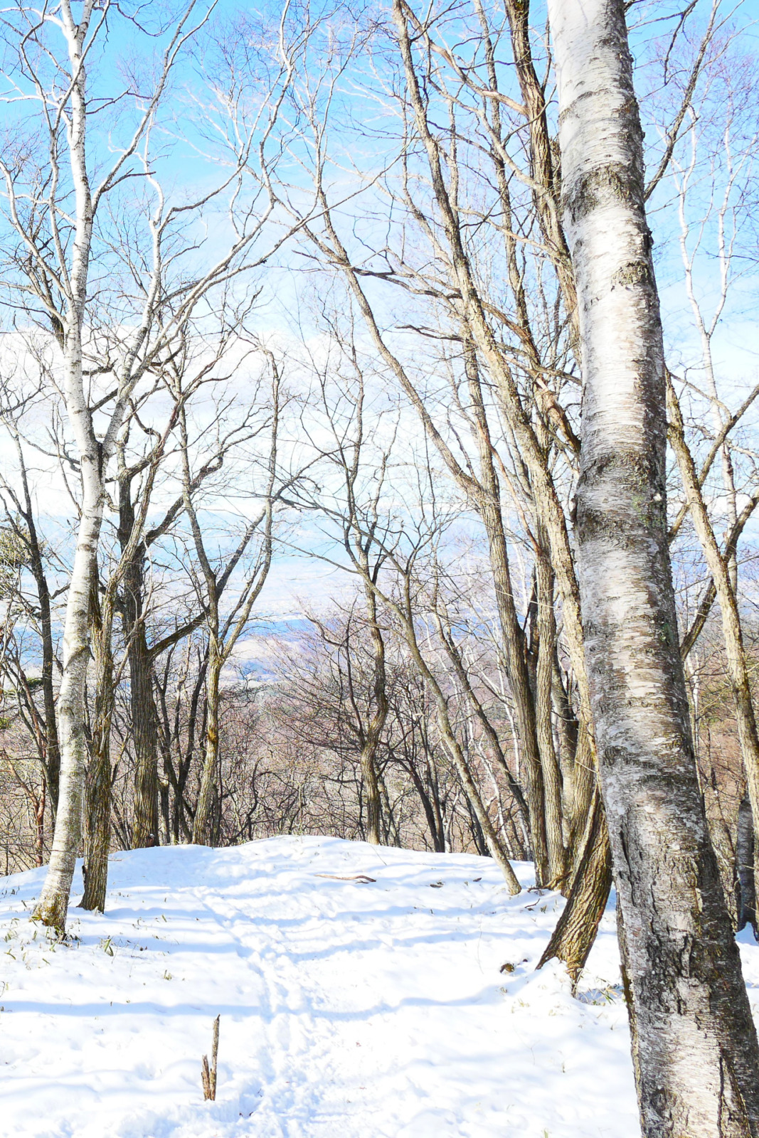 標高1,929mの鉢伏山。松本市街から牛伏寺に向かい、お寺の脇の登山道からスタートします。冬は鉢伏山荘までの車道ゲートが閉鎖されるため、歩いて登るルートのみ。始めは、落ち葉をふみしめながら登るゆるやかな林道。しばらくすると少しずつ雪が残る道となり、途中で軽アイゼンを装着しました。そのあとは傾斜が少しきつくなりますが、車道に出ると青空が広がり、またゆるやかな道になります。