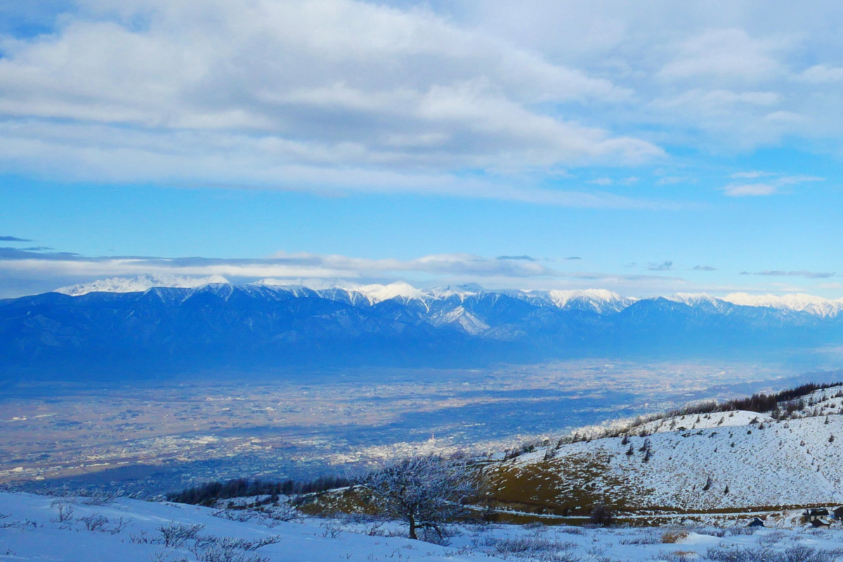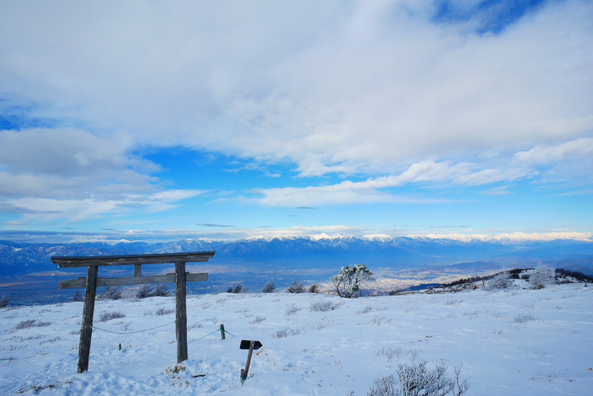 北アルプスの端から端まで、御嶽山、南アルプス、富士山、360度真っ白な山並みと青空と鉢伏神社の鳥居。眼下に松本の街が広がる中での雪山の凛とした空気と無音の静けさに浸り、ただずっと眺めていたい気持ちでした。
