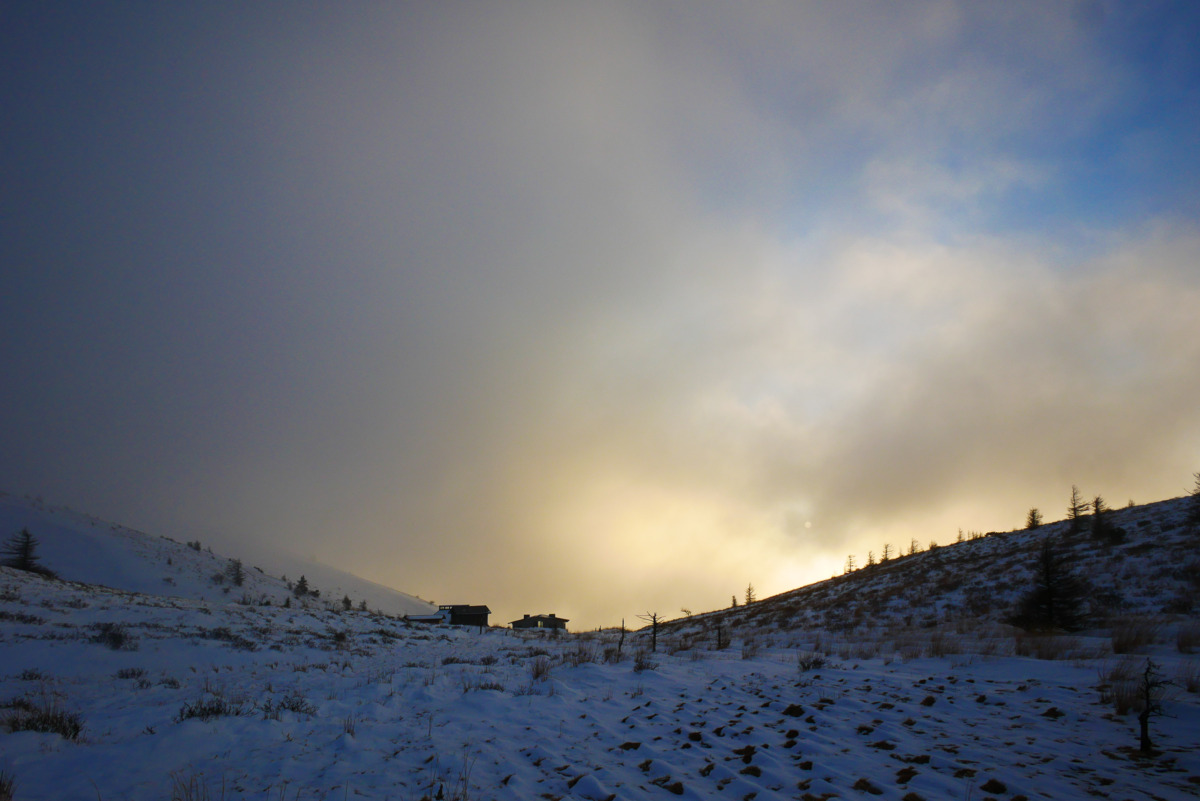 夕暮れ時は、流れる雲のあいだから見える塩尻の街明かりが美しく、街が近い雪山だなぁと、不思議な感覚になりました。