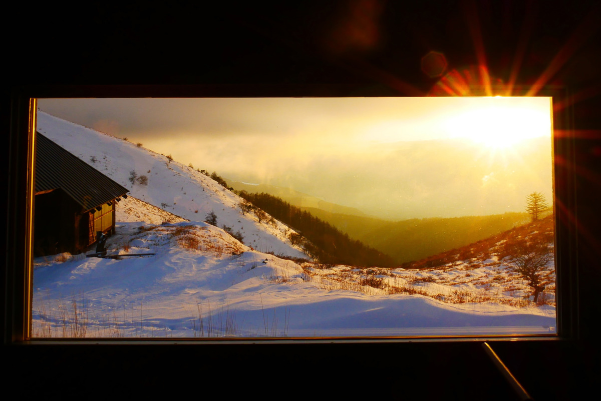 鉢伏山荘の宿泊棟は、金・土・日曜営業、1日定員7名のこじんまりした宿ですが、コンクリート製の清潔な建物で、大きな窓から見える景色がすばらしいことで有名です。