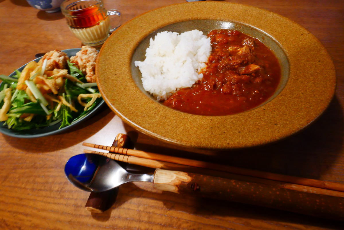 夕飯は、松本周辺のお店のレトルトカレーを数種類から選択するほか、地元の野菜を使った小屋番さんお手製の切り干し大根のサラダと揚げたての唐揚げなど。ほかのグループや小屋番さんも一緒に食べる空間が、とても心地よかったです。