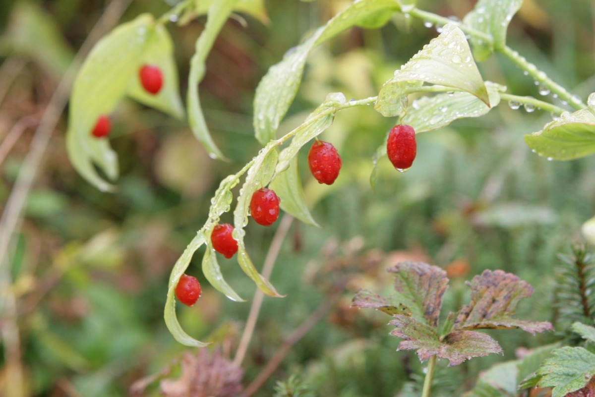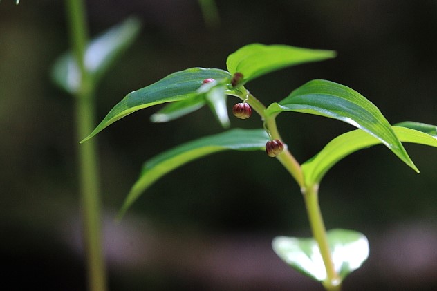 若者の主張ならぬ、“タケシマラン 星 人の主張”は続きます。そう、本領発揮は夏が過ぎてから。果実になりゆくタケシマランに注目すると…。なんか、赤くなりかけた果実の茎が、くるんとしてる…?「ソウダ、ソコガ チャームポイント ダ!」。彼らが胸を張るのもそのはず、茎がマンガチックに丸まるのは、タケシマランの一種、オオバタケシマランの特色のひとつ。これがさらに秋深まると…。