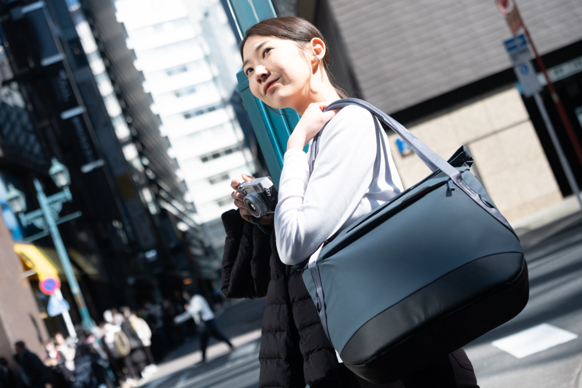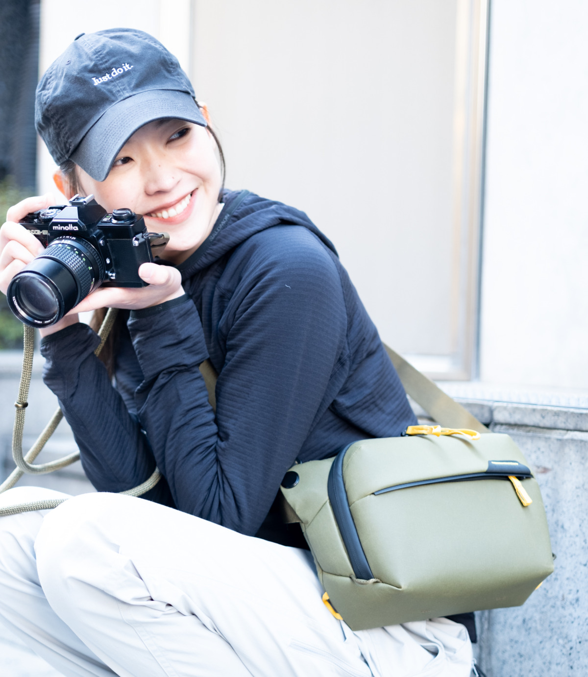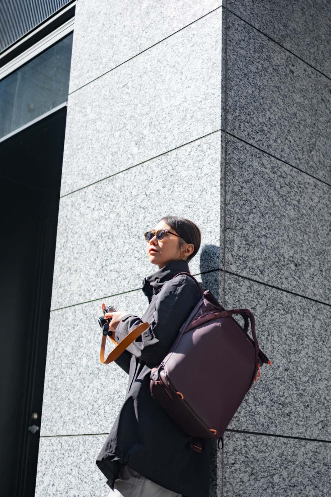 撮影の合間、ふとした会話にくすっと笑ったり、「それすてきですね」とアイテムを手に取って目を輝かせたり。その空気感に包まれて、レンズ越しのこちらまで、ふっと笑顔になる。銀座の街並みのなかでも、Peak Designのアイテムはまったく浮かない。むしろ、その人の雰囲気にそっと寄り添っていた。
