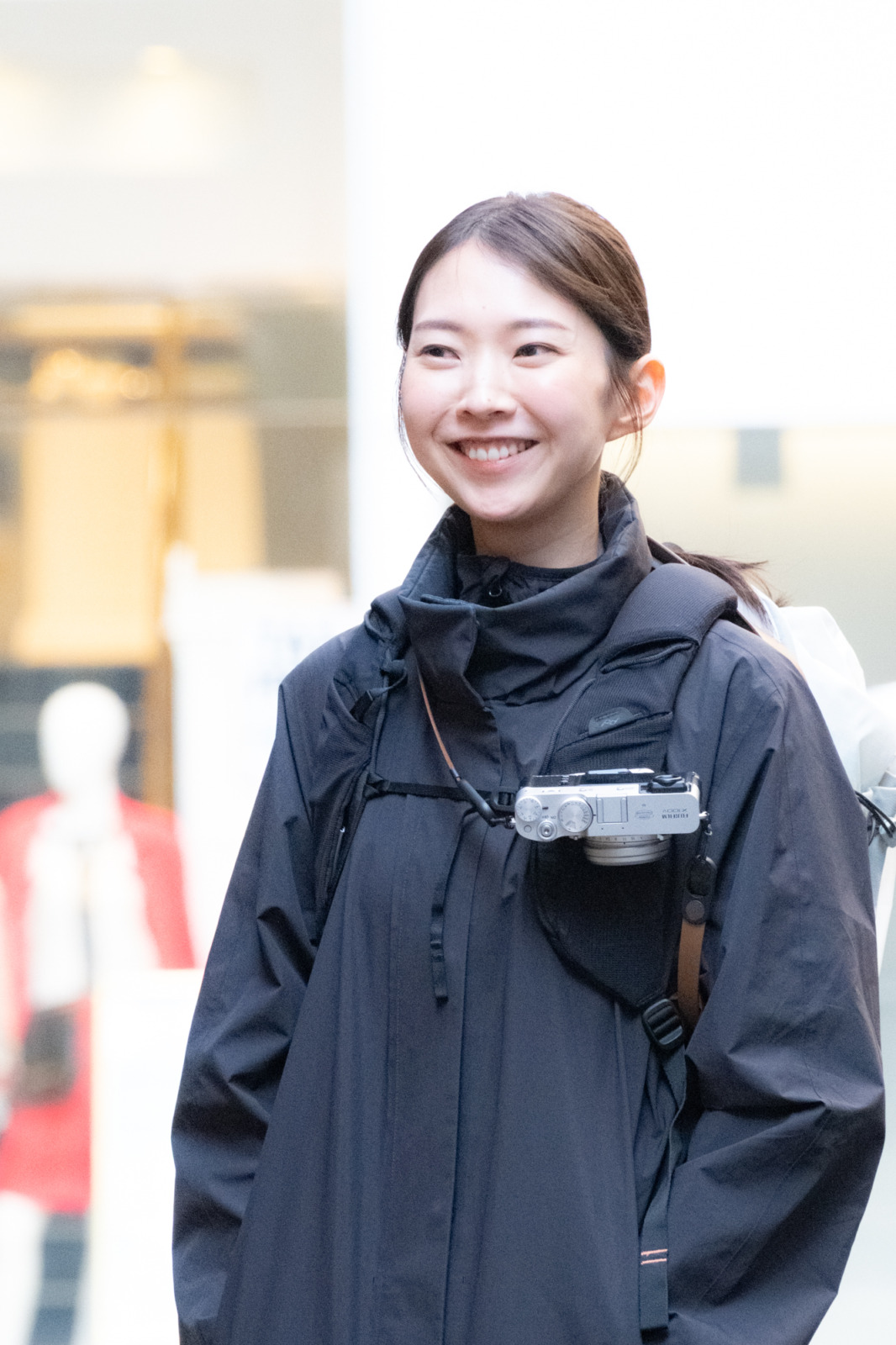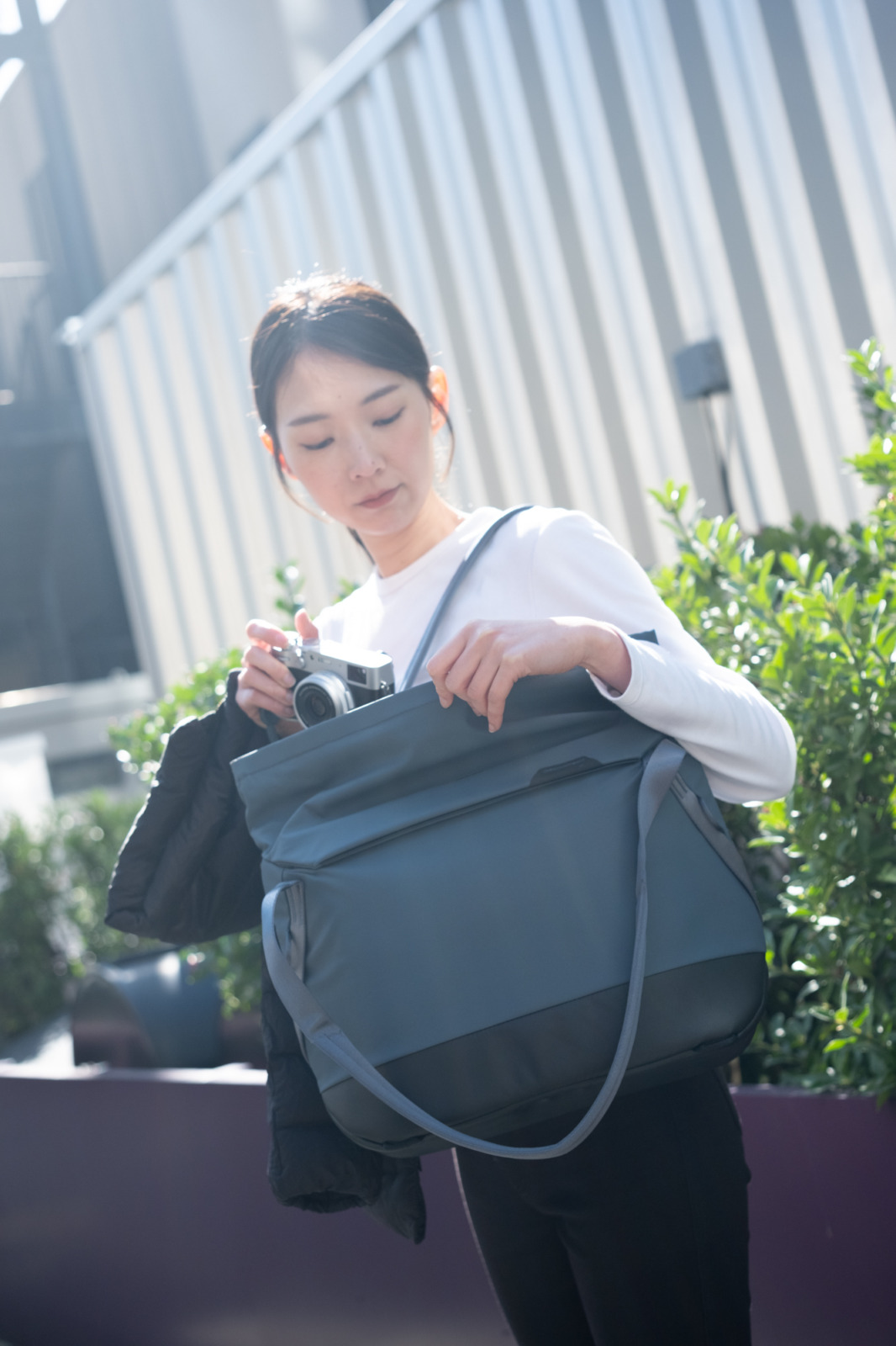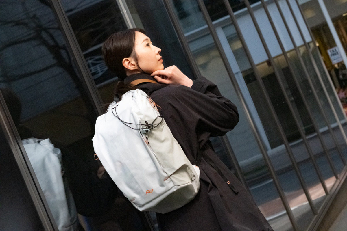 撮影の合間、ふとした会話にくすっと笑ったり、「それすてきですね」とアイテムを手に取って目を輝かせたり。その空気感に包まれて、レンズ越しのこちらまで、ふっと笑顔になる。銀座の街並みのなかでも、Peak Designのアイテムはまったく浮かない。むしろ、その人の雰囲気にそっと寄り添っていた。