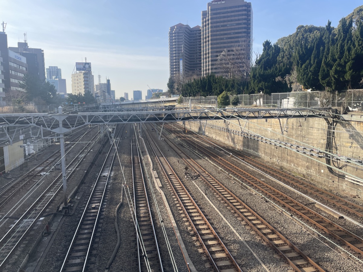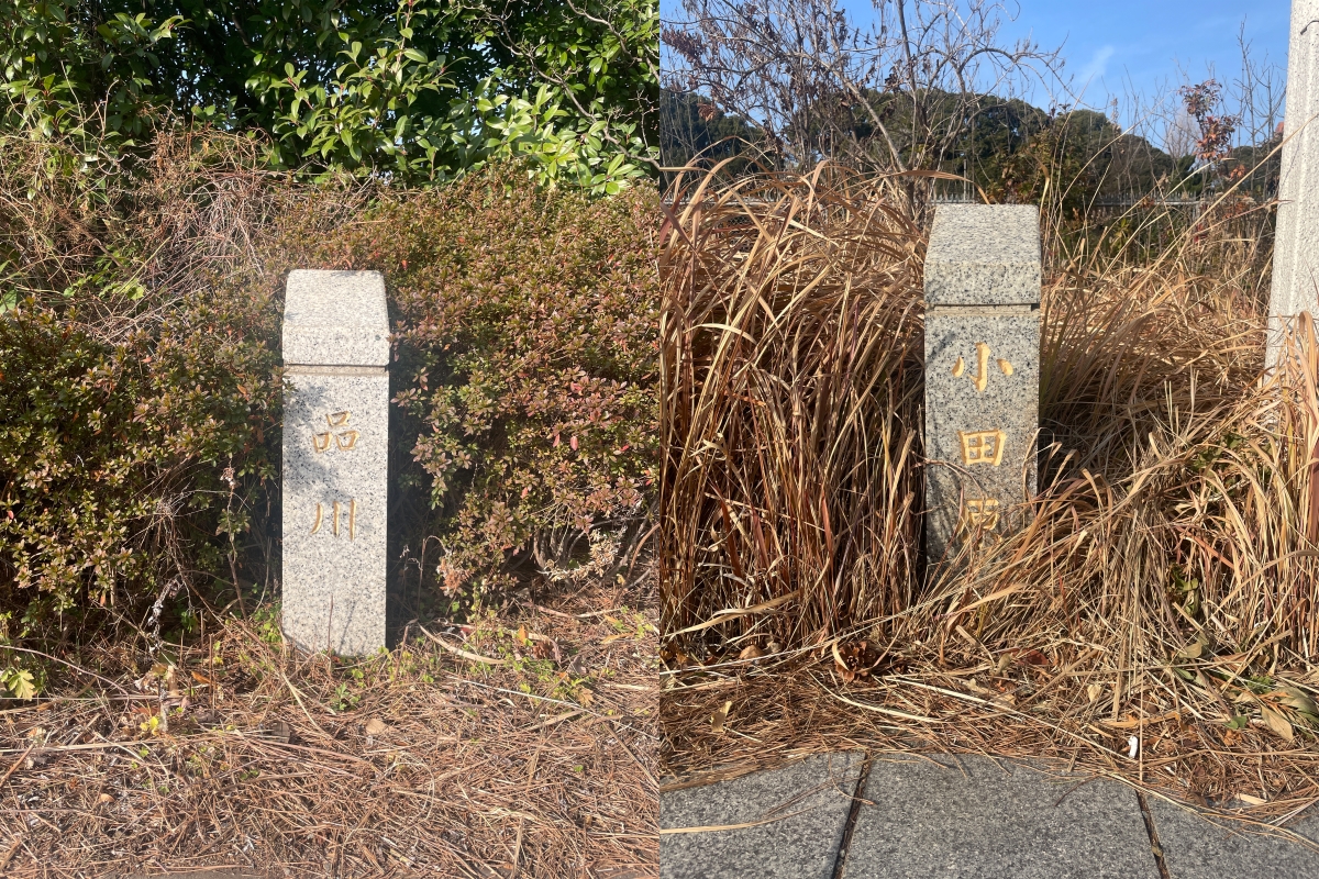 北品川駅から八ツ山橋へ向かう途中、東海道五十三次の宿場が書かれた石柱が並んでいて、ミニチュア東海道中を楽しめます。また八ツ山橋からは無数の線路を眺めることも。ここは明治初頭、線路を通すために御殿山の地形を切り開いた切通しなのです。
