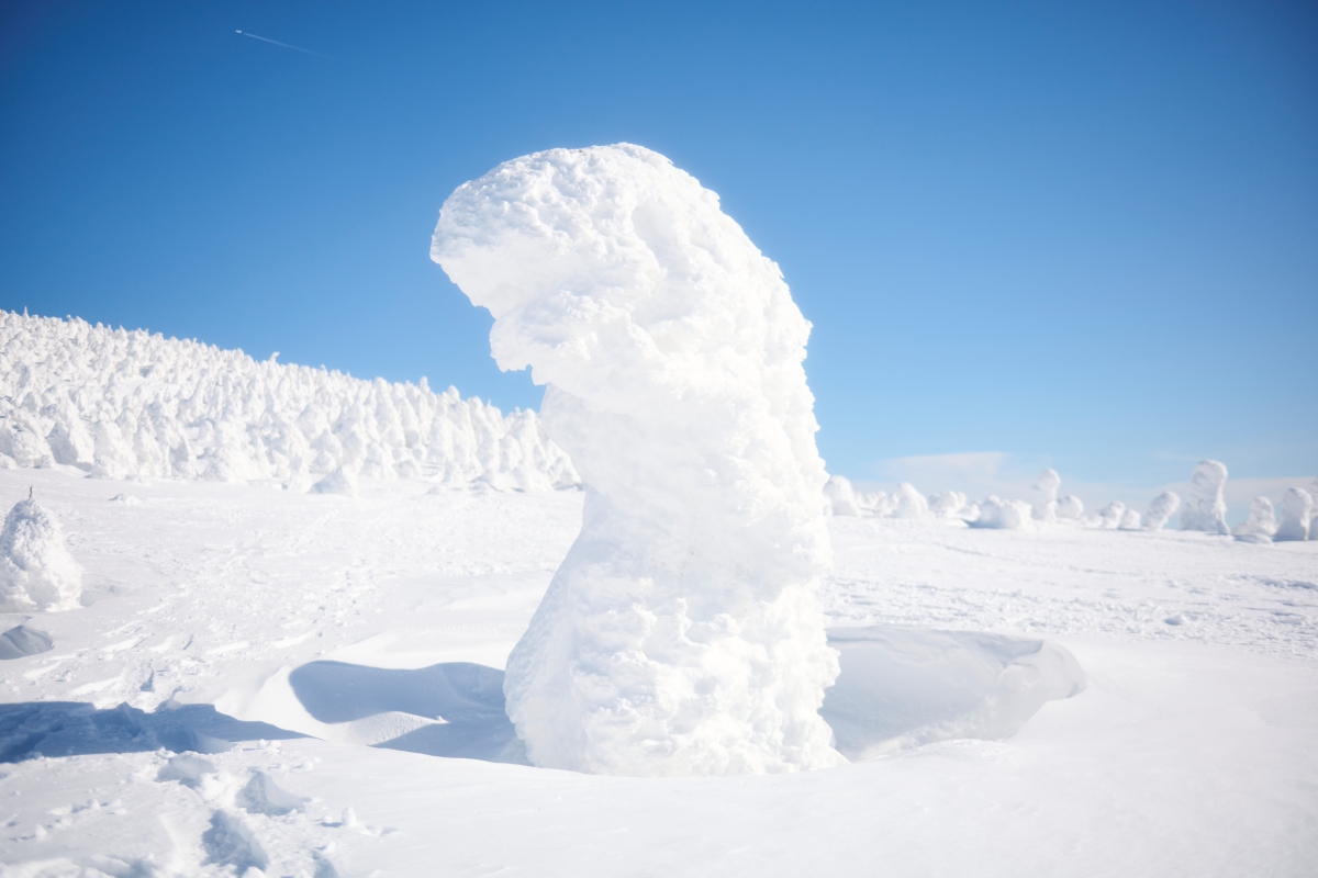 この日は快晴。登り始めてすぐに、疲れよりも暑さでぐったり。作ってきた熱々のお茶も、そのままでは飲めたものではありません。そこでボトルに雪を放り込み、ちょうどいい温度の冷たいお茶に。ゆっくりと歩き続けて、西吾妻小屋に到着したのは午後2時半すぎ。周りには見事な樹氷が盛り盛り状態で、思わず息子と顔を見合わせ歓喜。樹氷に囲まれてのテント泊は、まるで南極のようでした。