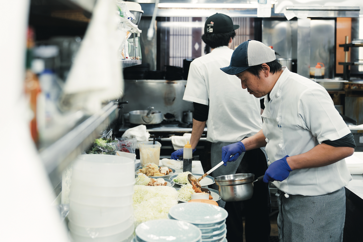 ▲店名の由来は、目の前に広がる青野山(あおやさん)。広々とした厨房では、次々に入る注文にスタッフがテキパキと動き、活気に満ちている。ドレッシングやソース、タレまでほとんどが自家製だ