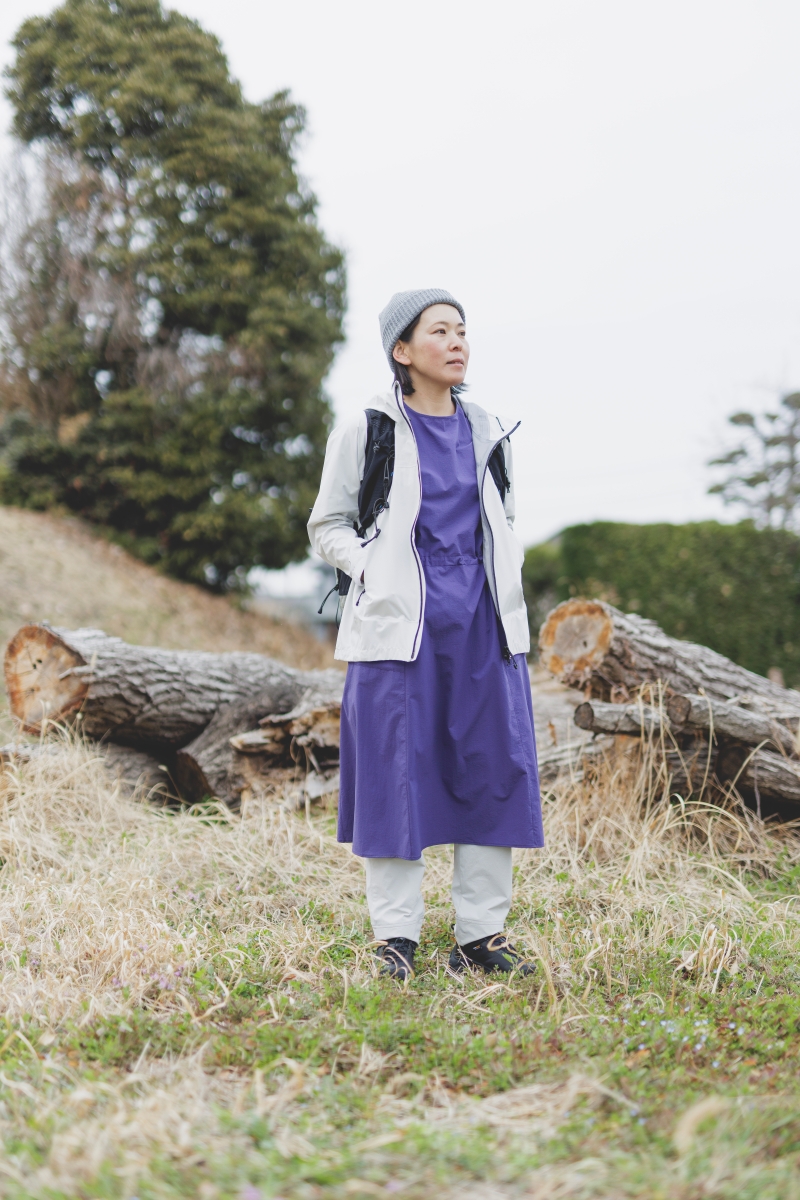 肌色や体型の変化などが気になり始める40代。いつまでも自分らしく自然を楽しむために、体型をカバーできるウエアが心強い味方に。コーディネートの主役となるワンピースは、大人に似合う落ち着いたパープルをセレクト。ウエストに配されたドローコードを絞ることで、バランスよく着用できる。ホワイトカラーのアウターは、ハイライト効果で顔回りを明るく、華やかな印象に。腰回りはゆったりと、足元にかけてテーパードするシルエットのパンツも活躍間違いなし。