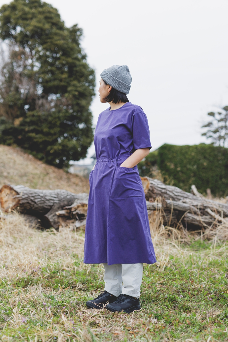はっ水リップストップ生地を採用したワンピース。縦横2方向に伸びる優れたストレッチ性を備えるほか、通気性が高く、春から夏まで快適に着用できる一枚。軽量でシワになりにくく、左内側ポケットに小さく畳んで収納・持ち運びができることから、山旅での着替えとしても重宝する。