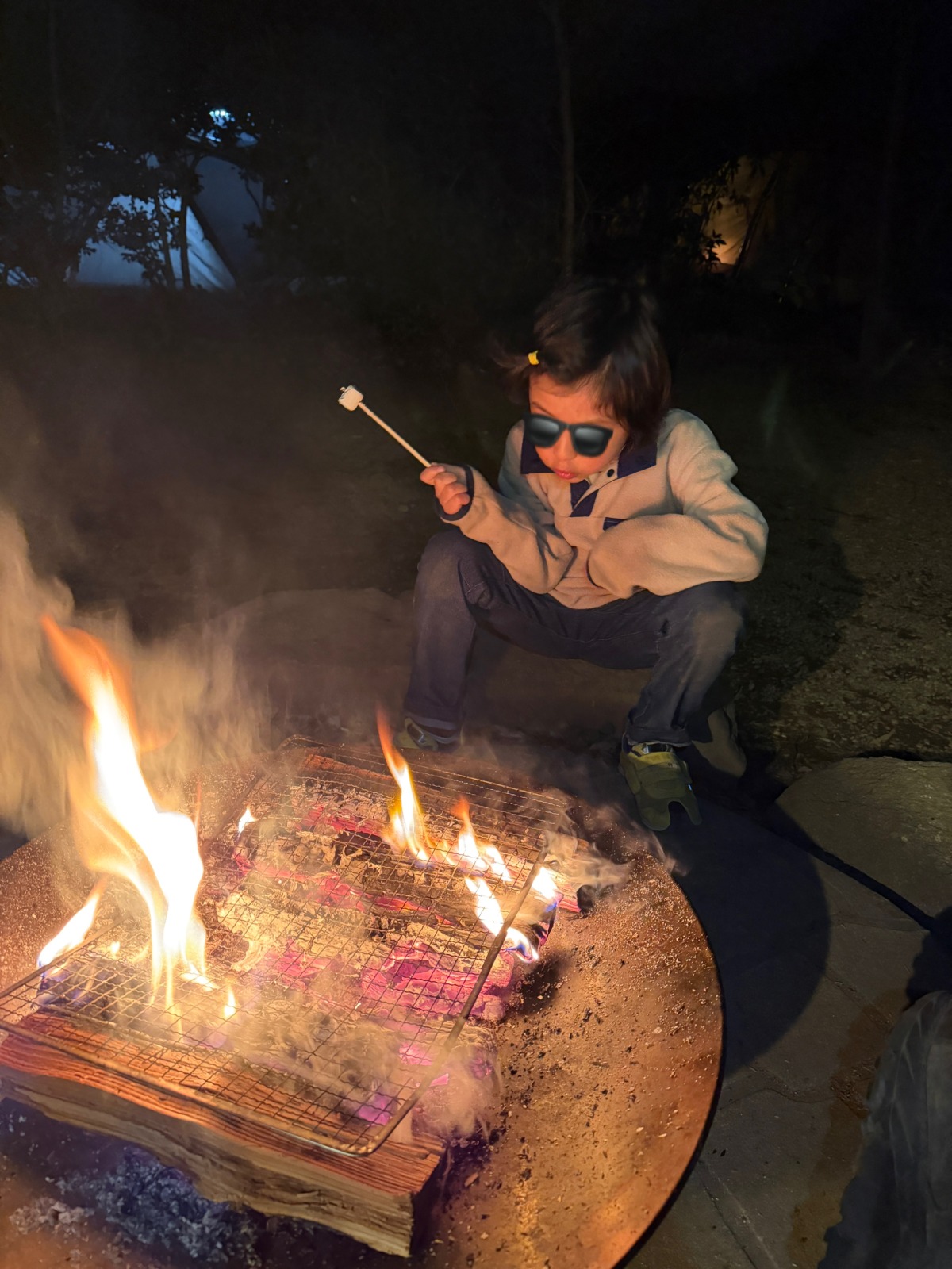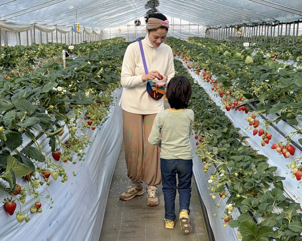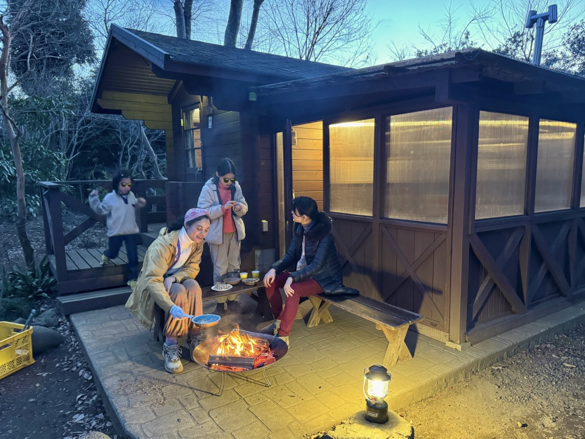 子どもといっしょにおこした火を囲み、次々焼く新鮮な食材を頬張り、夜の暗闇と星空を楽しんだら、キャビンでぐっすり。ちょっぴり非日常、でも親も子も疲れないキャンプ。朝ごはん代わりに、併設の農園でイチゴ狩りをたっぷり満喫して締めくくりました。