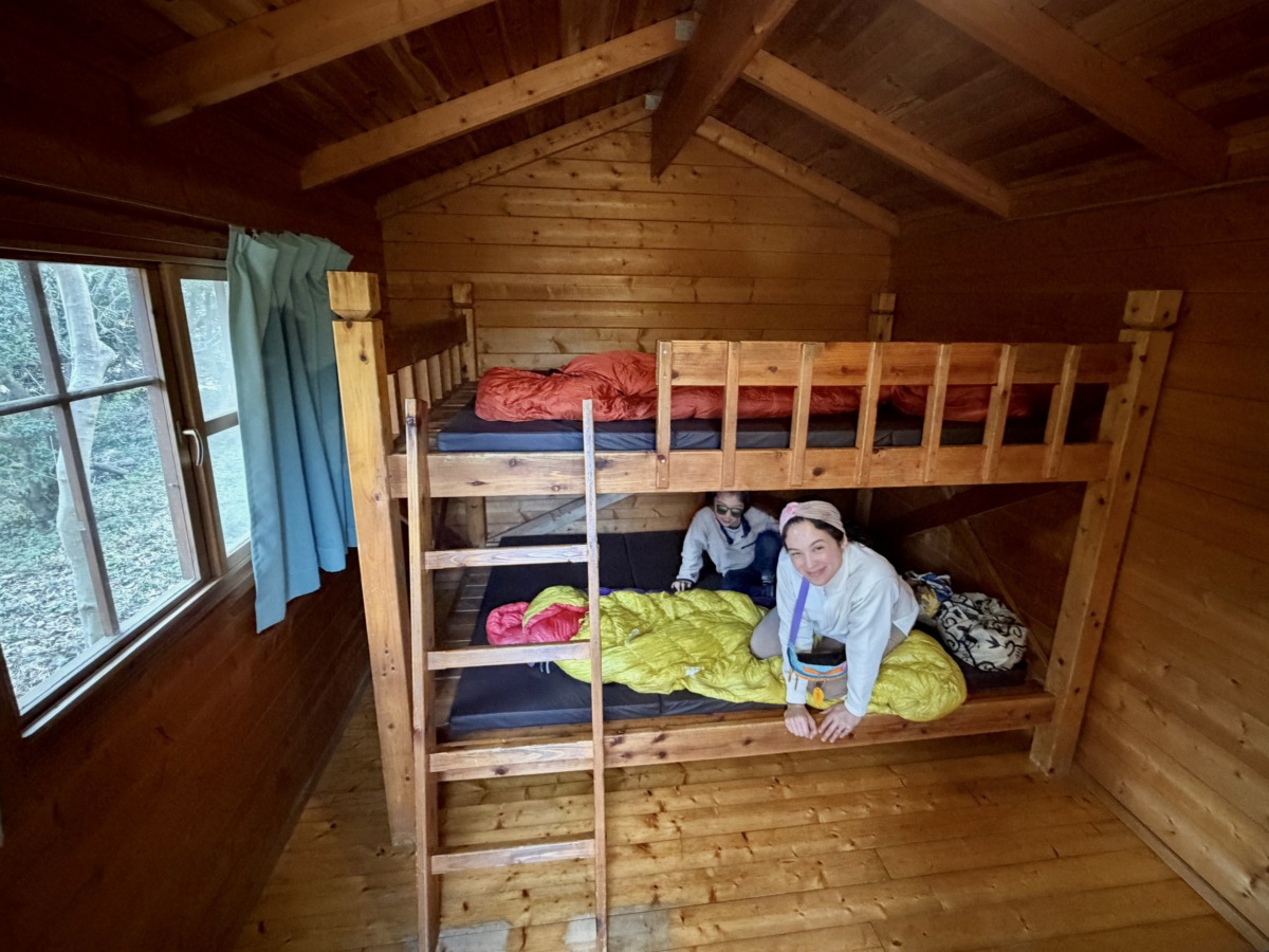 ▲キャビンタイプの室内。同行したキャンプ初心者の姉と姪は、キャビンのエアコンと、共用の岩風呂があることに安心したみたい
