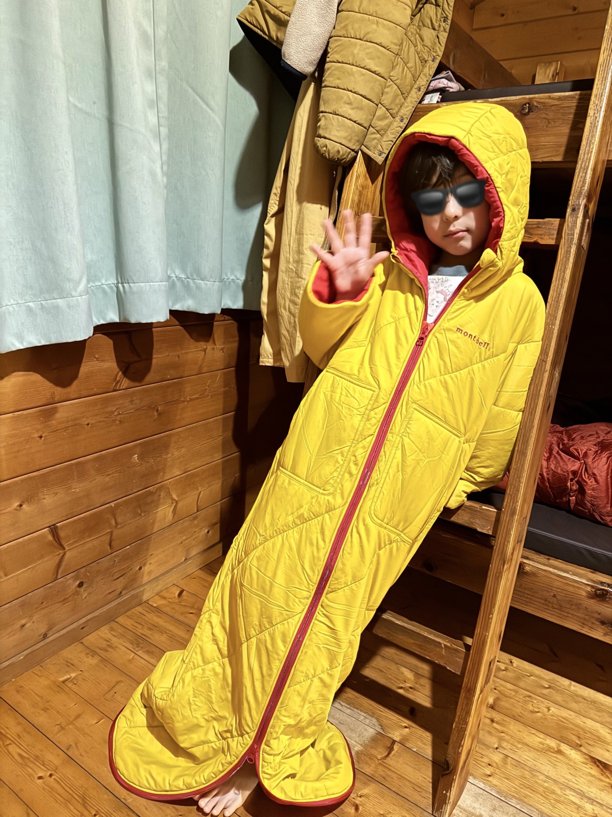 息子の寝袋は、モンベルのバロウスーツ。着たまま動き回れるし、そのまま眠れる。キャンプで興奮した子どもにピッタリ。非日常の環境で寝袋で寝る体験は、防災にも繋がると考えています。