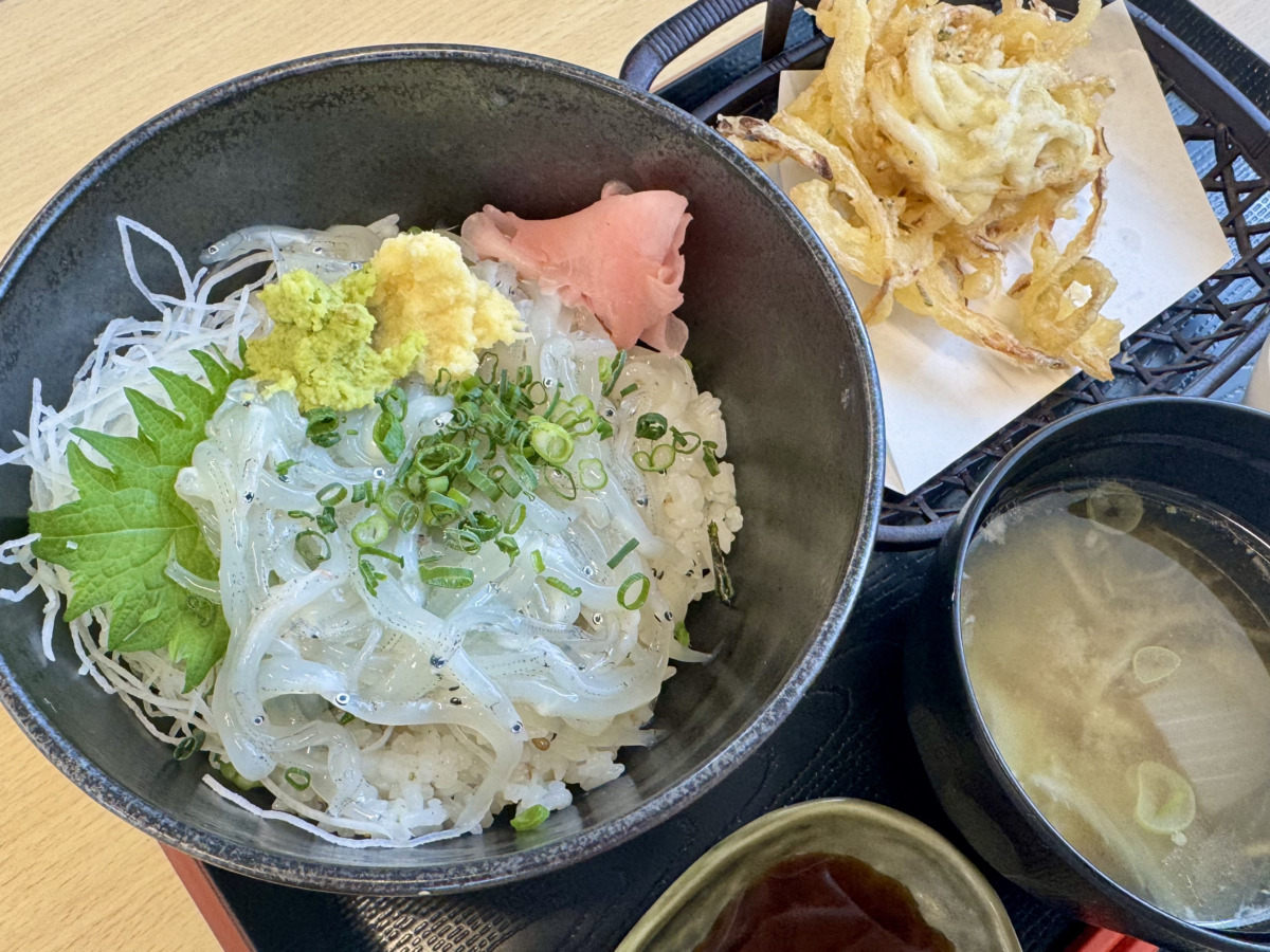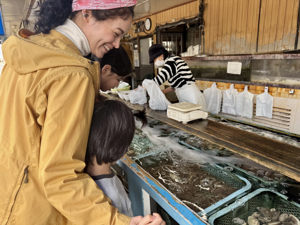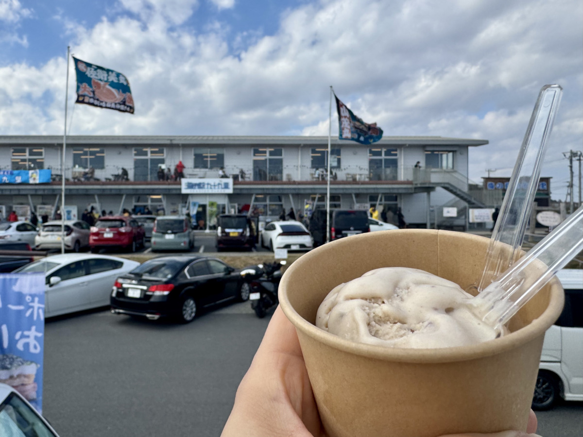 到着日のお昼ご飯は、道の駅ならぬ海の駅で、とれたての海鮮を!フードコートのほかに、直売所やイワシ漁の資料館も併設。私は春告魚の異名を持つ白魚をチョイス。デザートには落花生アイス。子どもたちは初めて見るアコウダイに釘付け。