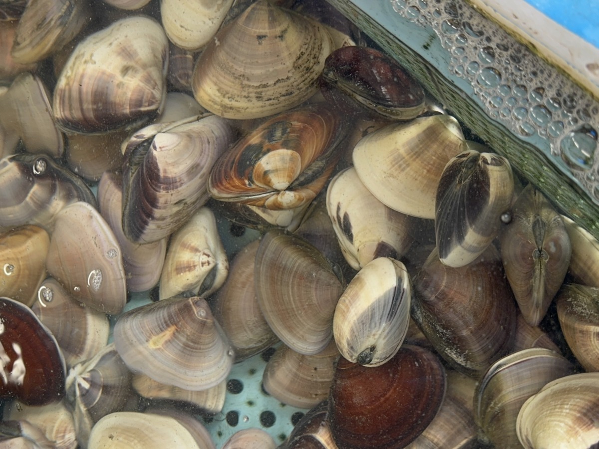 ▲直売所・橋本水産で、九十九里のハマグリとサザエをゲット。大粒!