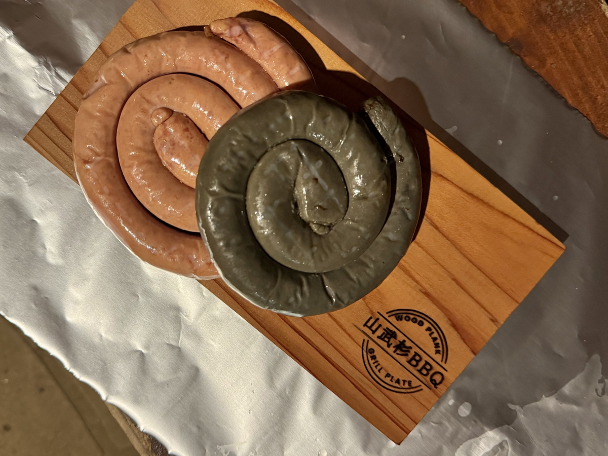 ▲特産・山武杉の板を使ってプランクBBQにも挑戦。地元ジビエのソーセージに、板の香りをうつして楽しみます。全て有野実苑で購入