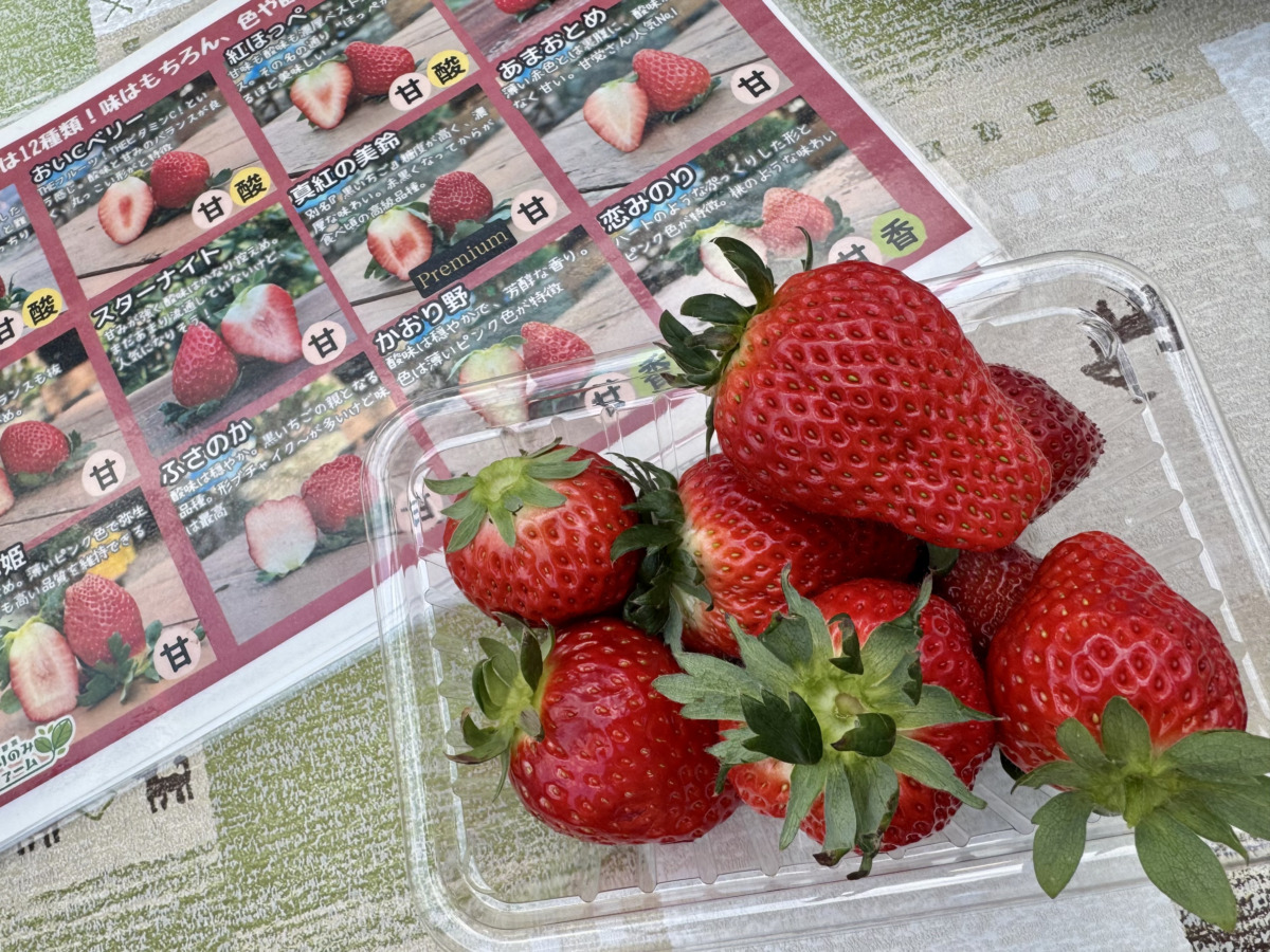 ▲食べ比べが楽しい、有野実苑のイチゴ狩り。この日は13もの品種が! 山武市成東は国道126号がストロベリーロードと呼ばれるほど、苺農園が集まっている。有野実苑併設の農園では、敷地内の落ち葉や焚き火で残った灰を活用しているそう。ブルーベリー狩りや野菜の収穫など、季節によってさまざまな体験ができる