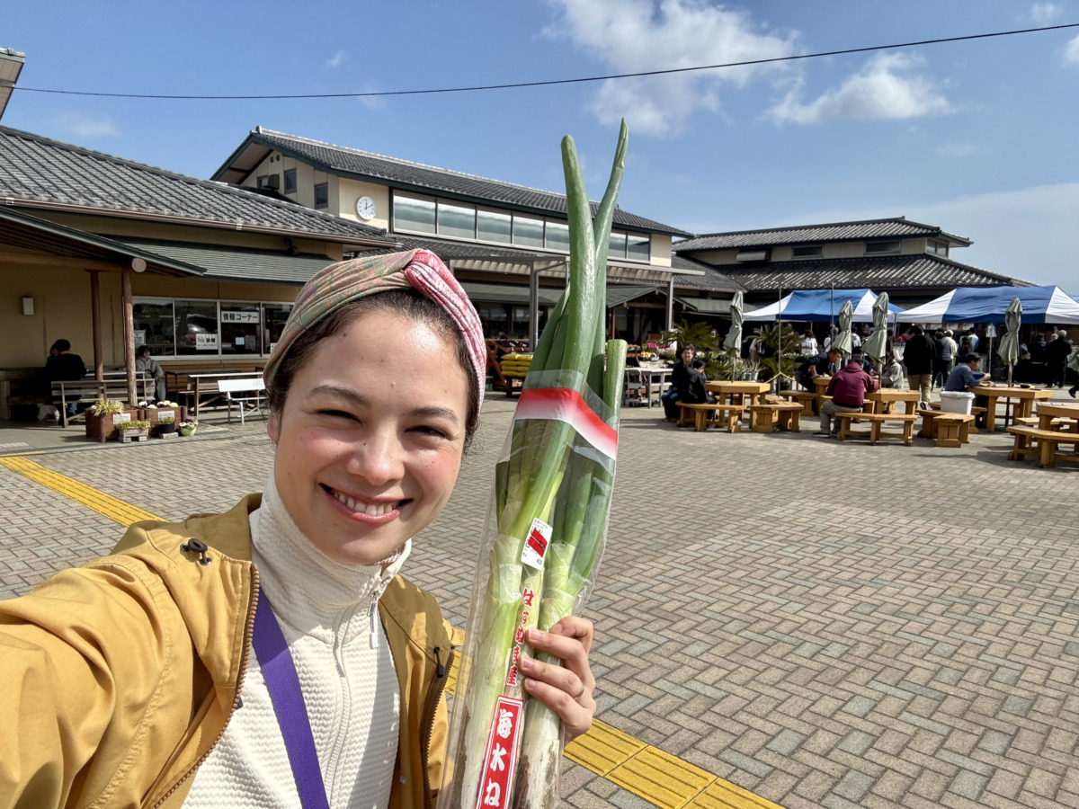 地元産の食材の買い出しや、お土産選びにピッタリの道の駅。海水をまいて育てる甘くて立派な「海水ねぎ」を発見。じつは千葉はネギの生産日本一。山武の春はあちこちにネギ畑が広がる。