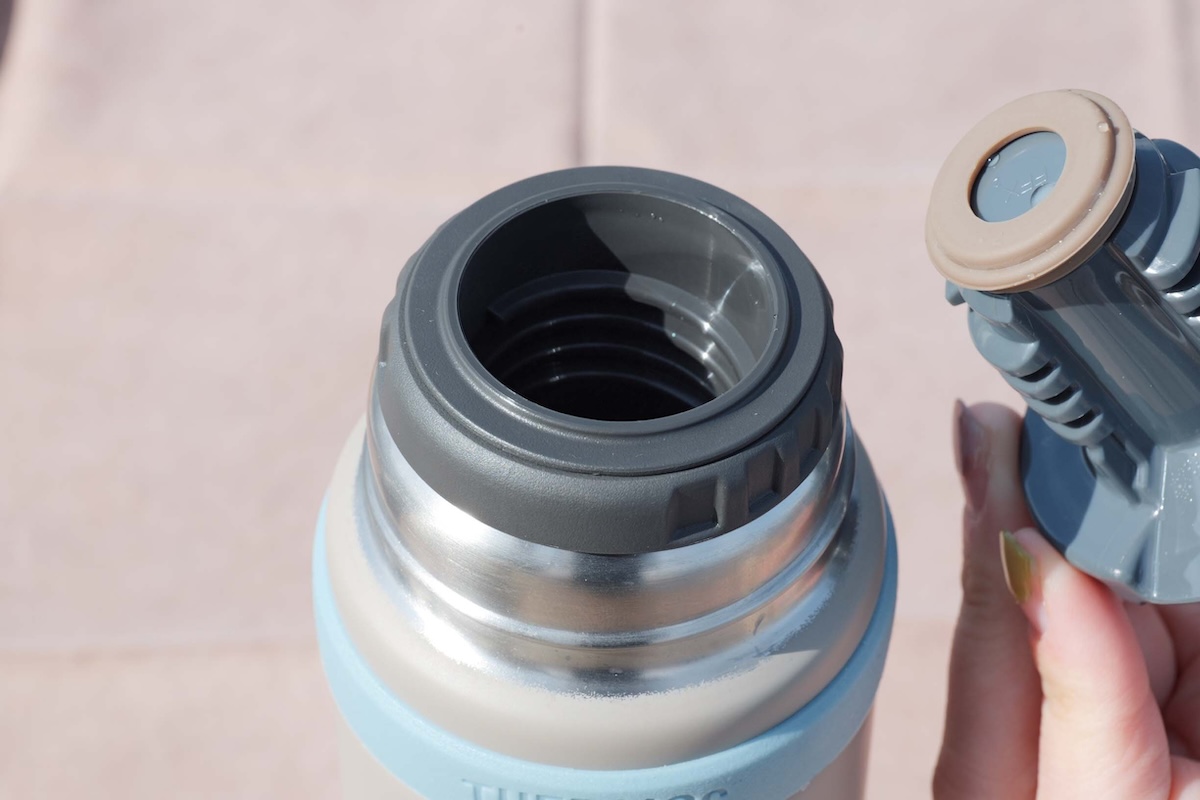 口径はφ36㎜。グローブを装着したままでも操作しやすいデザインは、山で使うことを考慮された設計ならでは。中栓を外せば氷も入れやすい。握った感じはやや太め。表面はマット加工なので滑りにくい。