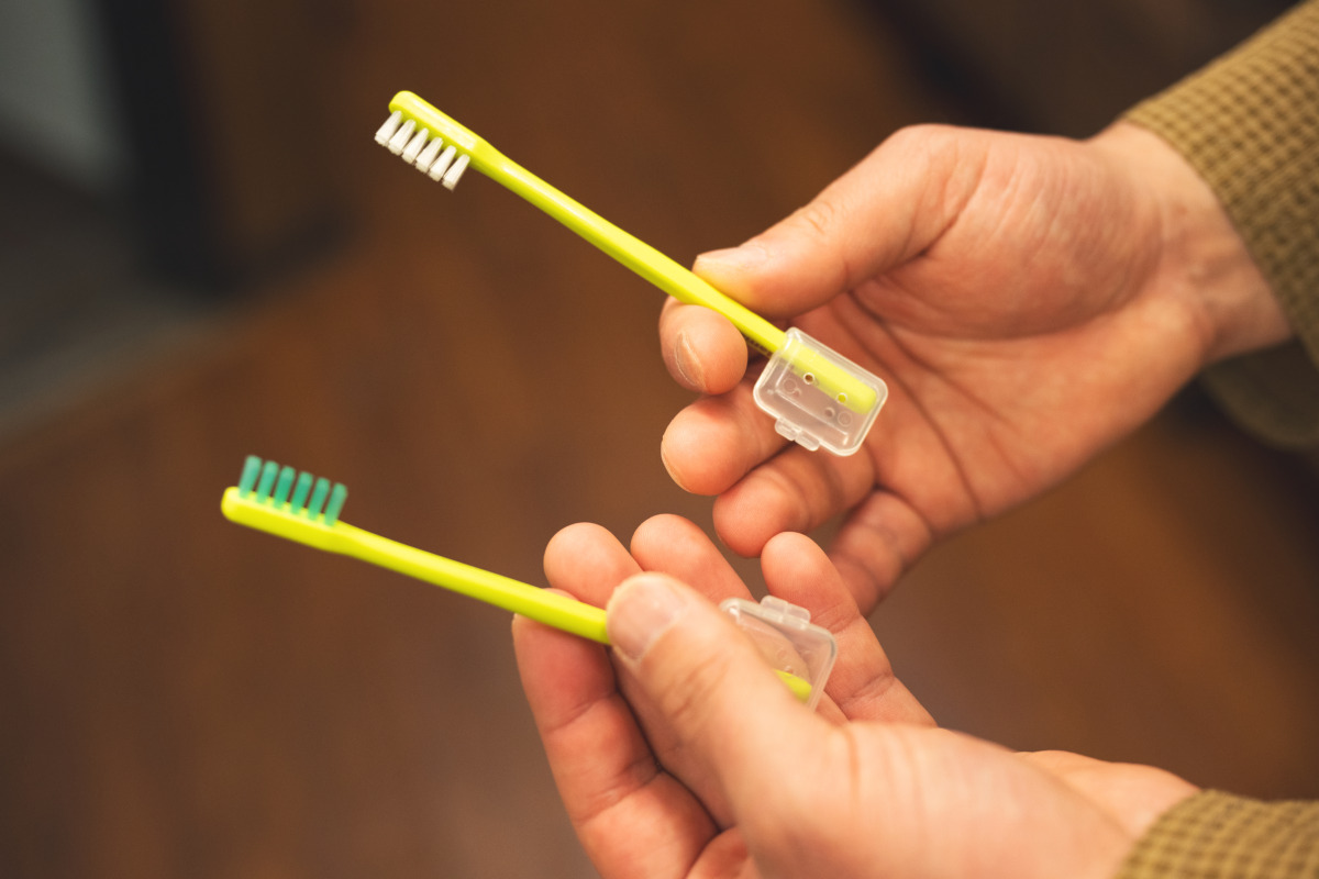市販の歯ブラシを山用に短く削っていたことから開発された、Kodamayaの超軽量歯ブラシ。柄は細くて短く、重量わずか4.6g。かため、やわらいめの2種類あり。カバーは柄にハメて使えば持ちやすくなり、なくす心配もなし。